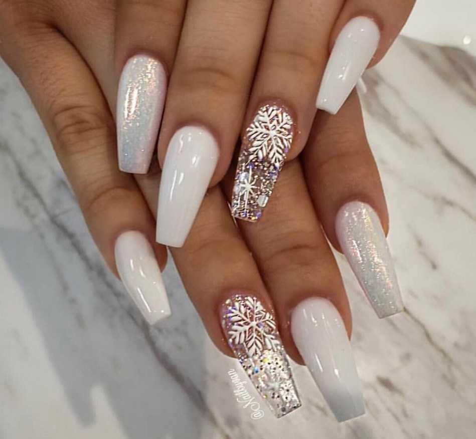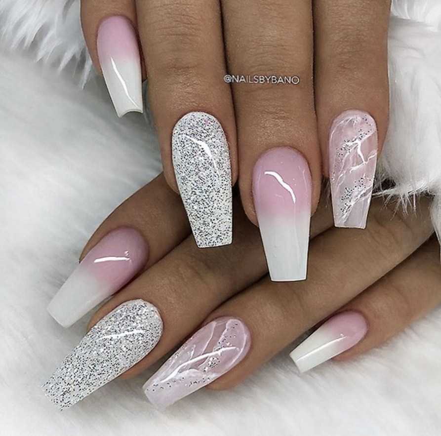 Самодостаточный маникюр «балерина» очень легко испортить. В случае с блёстками главное правило – не переборщить. Прорисовывайте блестящим лаком геометрию, тонкую улыбку френча или лунку у кутикулы. Используйте блёстки не на всех ноготках, на 1-3 на руку.