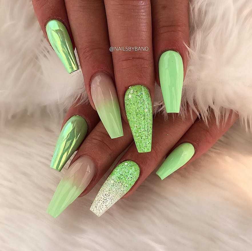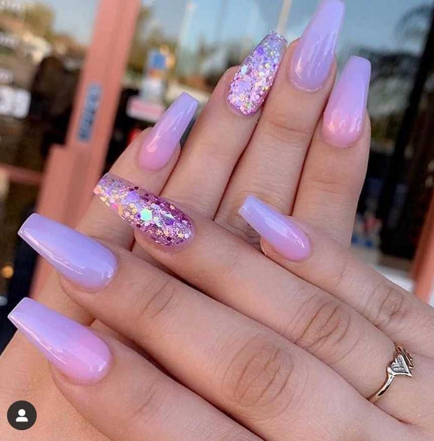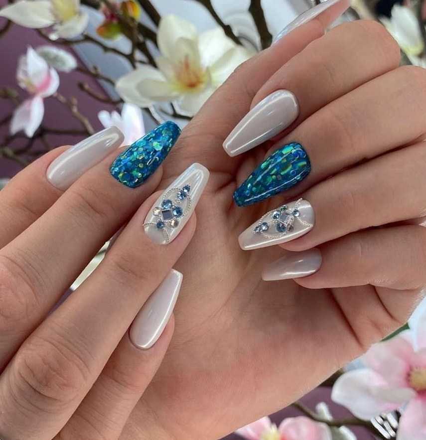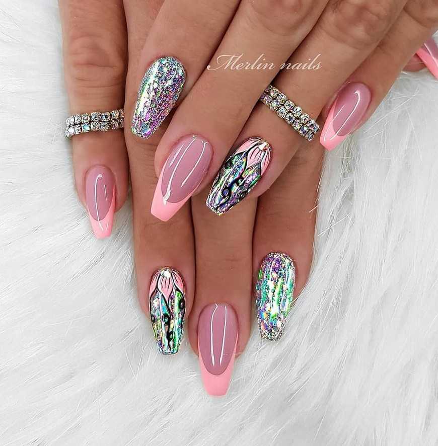 Если девушка хочет сделать стильные молодежные ноготки на среднюю длину, обязательно использование блесток. Здесь главное не перестараться, и не лепить блестки на все ногтевые пластины.