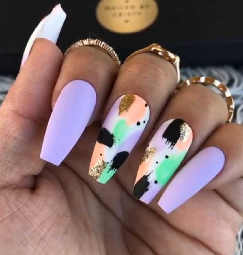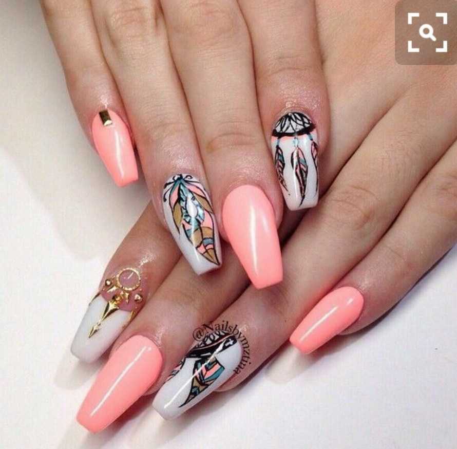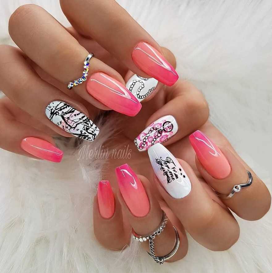 Делала маникюр с рисунками вы можете полностью использовать свою фантазию. Есть много методов можно придумать много интересных вариантов. Наверняка, у вас есть свои идеи. Дизайн рисунки на ногтях эта форма выглядит более смелые, экстравагантные и очень современный. Вы можете использовать любую комбинацию цветов, нанести нежный или точного графика. Несколько интересных идей вы найдете на фото. Выполнение маникюра можно использовать блестки, стразы и любые другие украшения.