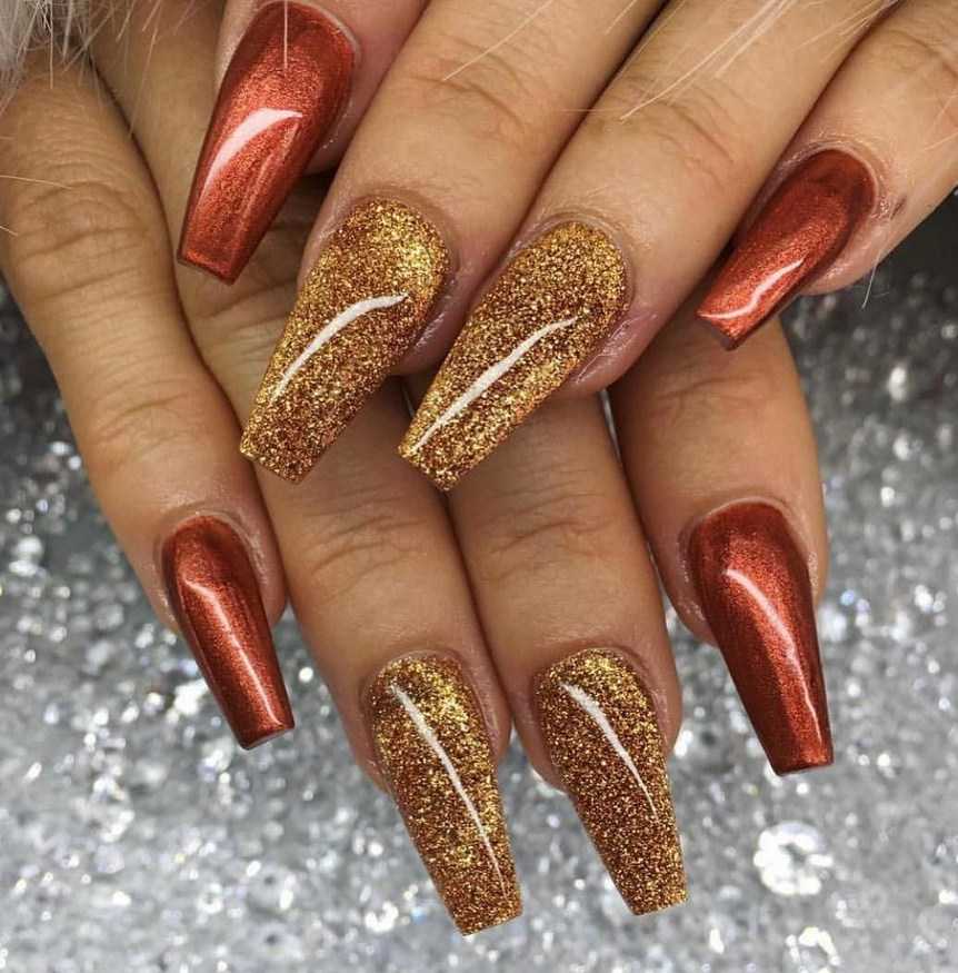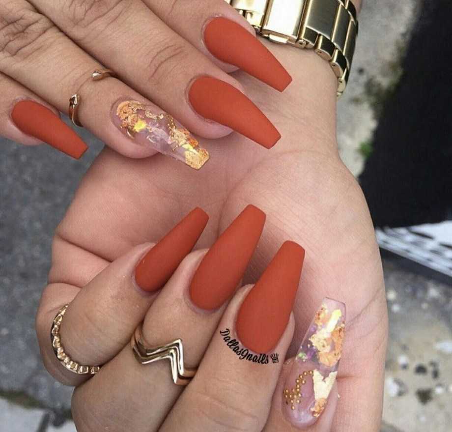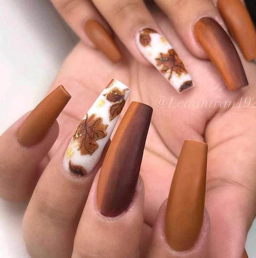 Традиционно осенние виды маникюра – это однотонные покрытия насыщенных, глубоких тонов – изумрудного, синего, бордового, коричневого. Также можно использовать тематические осенние рисунки, позолоту.