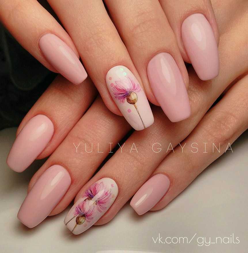 Основная рекомендация для такого маникюра – применение нежных оттенков, небольших флористических рисунков и ненавязчивого декора.