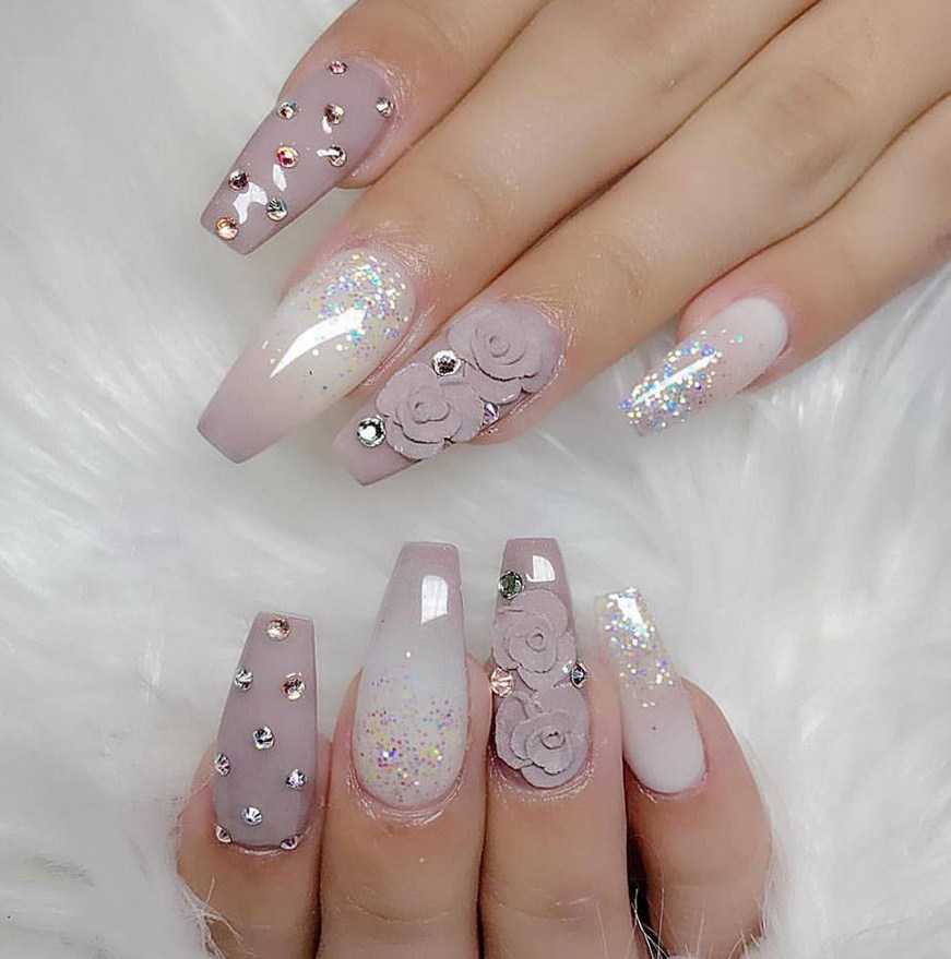 При маникюре формы балерина допустимы какие угодно украшения. Вы можете использовать не только всевозможные камешки, но и кружево, бантики, лепку, блестки. Все это сделает маникюр нарядным.