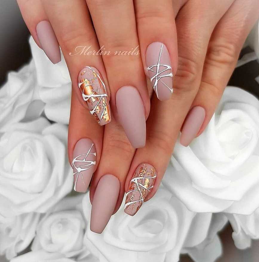 Маникюр балерины отлично смотрится на картинах. В таких дизайнах целесообразно выбирать минималистский стиль — абстракция, геометрия. Четкие линии помогают скорректировать неудачный опил — удлиняя пропорции и придавая маникюру правильный вид. Рекомендуется повторять углы опилочного маникюра и располагать линии рисунка вертикально или по диагонали.