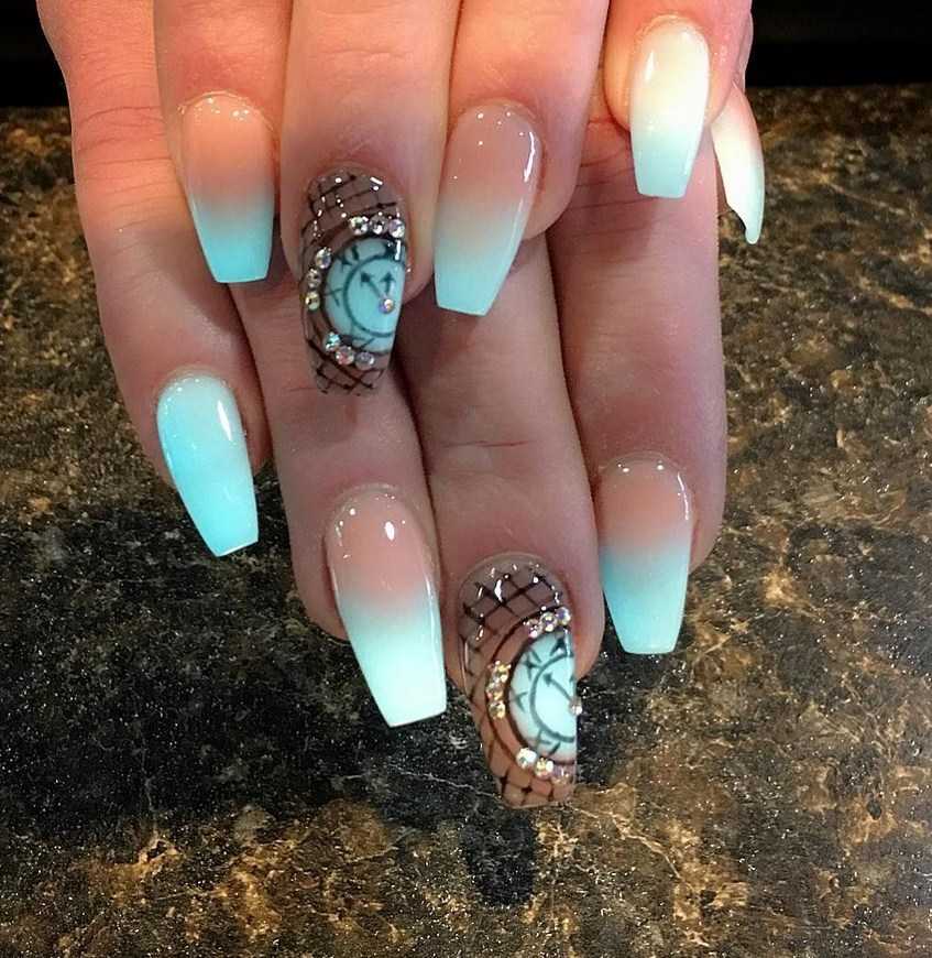 Для ногтей формы балерина можно использовать аквариумную роспись. Сейчас она в тренде. Выполняется такой дизайн акриловыми красками. Лучше всего такой маникюр делать у мастера, который сможет создать эффект аквариума быстро и качественно. К такому дизайну хорошо подходят стразы и цветной песок.