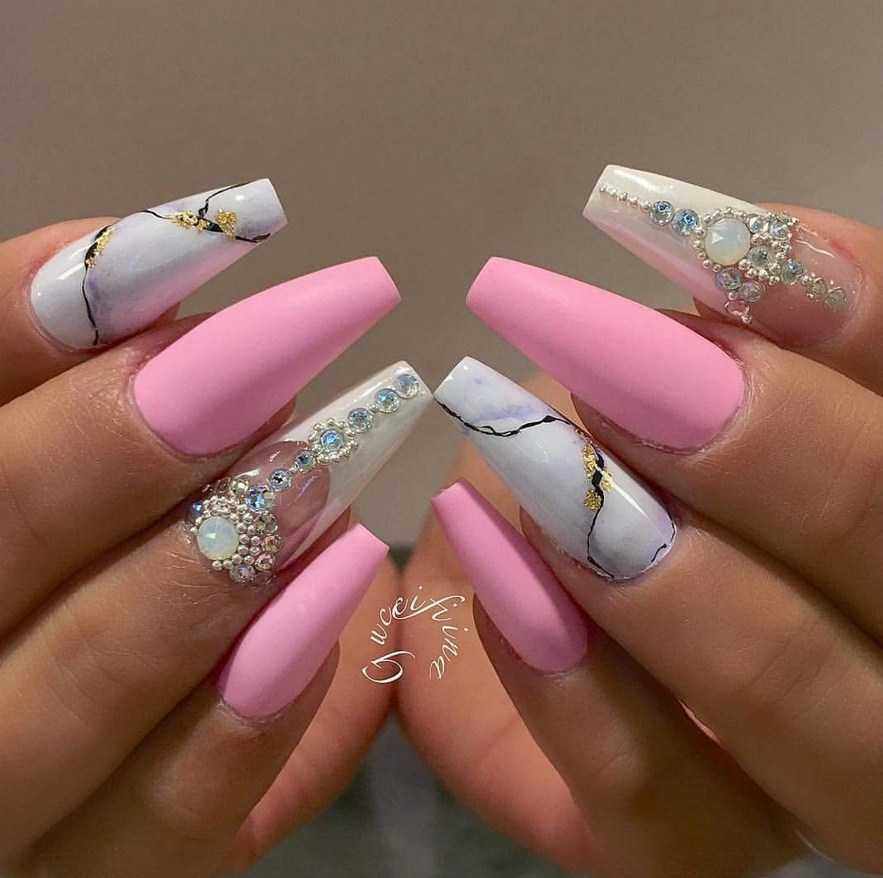 Тренд 2021 года в дизайне не нуждается. Если не хотите сидеть над оформлением ноготков, просто используйте однотонное покрытие. Но любителям дизайна «пуанты» предоставляют огромный простор для фантазий – длинные пластины получаются красивыми и со стразами, и с градиентом, и с геометрией.