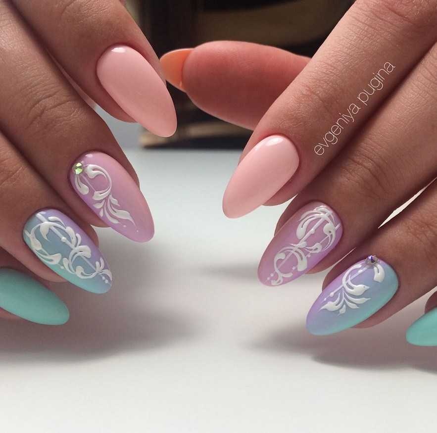 Длина ноготков с формой «пуанты» часто позволяет сделать молодёжное омбре из нескольких цветов. Сочетать можно близкие по оттенку или контрастные – от выбора будет зависеть только сложность смешивания.