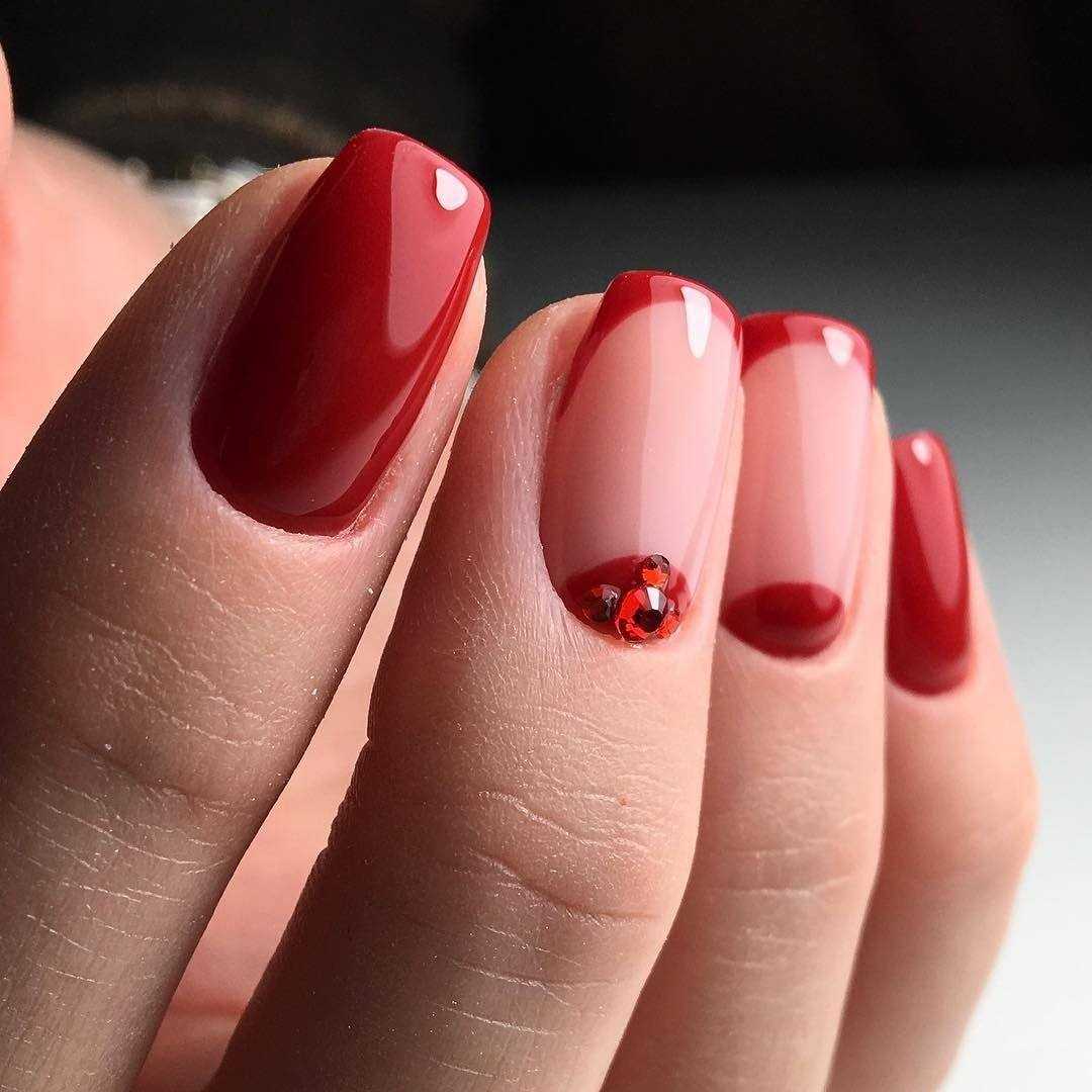 Сочетание красного и винного, рубинового, вишневого — отличная идея дизайна в стиле омбре. Для других вариантов декора лучше выбирать разные по плотности оттенки лака, чтобы получился эффект многослойности, а не двухцветности.