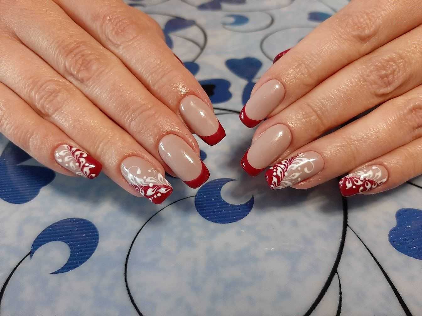 Лунный красно-белый с бежевым маникюр в сочетании с вензельной росписью: нестандартное оформление лунки узорами.