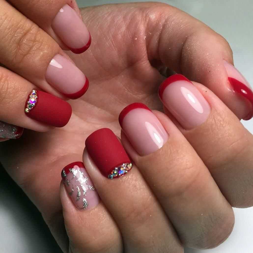 - Сочетание матового и глянцевого. Это решение оригинально для всех видов и цветов френча. Не стоит обходить красный французский маникюр стороной, ведь использование матовой подложки в тандеме с глянцевым гель-лаком всегда актуально;