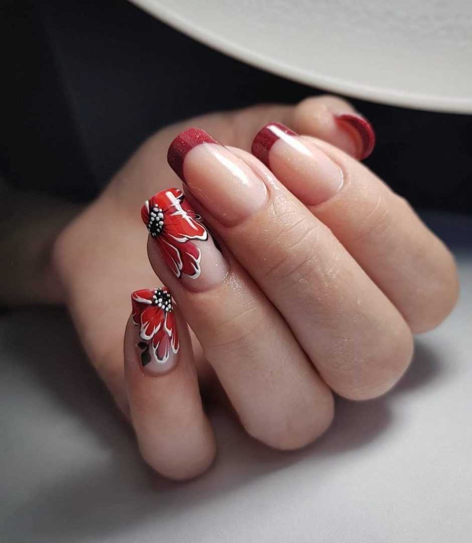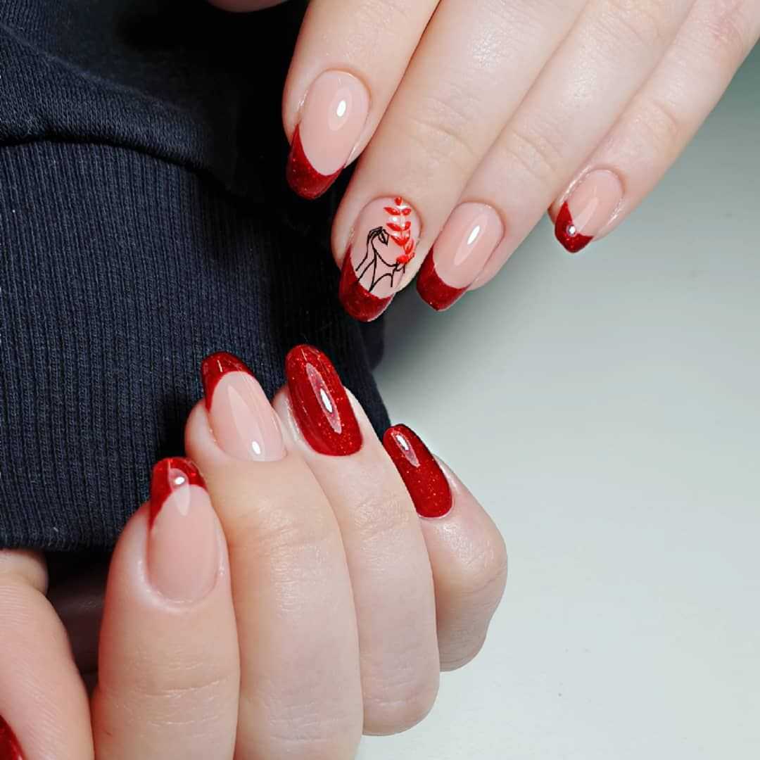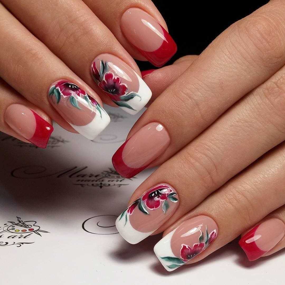 Довольно смелый цвет, который способна себе позволить не каждая женщина. Не стоит его бояться, ведь френч выглядит очень нежно, особенно в сочетании с рисунком. Оттенков красного цвета невообразимо много, можно поиграть с яркой гаммой, чтобы быть замеченной окружающими.