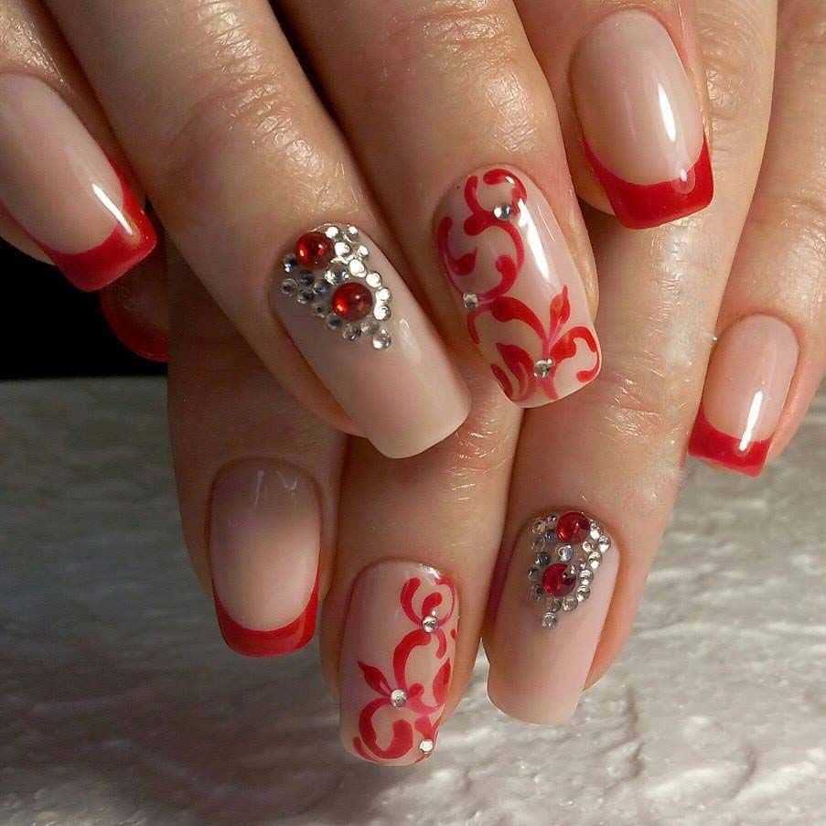 Для любительниц объемных украшений для ноготков, блеска и стразов, безусловно станет приятной новая тенденция — красный маникюр френч со стразами или бульонками. Крупные элементы или россыпь мелких в сочетании с таким смелым тоном смотрят очень величественно и притягательно. Если расположить стразы у основания ногтя в форме треугольника, то получится замечательная комбинация. Особенно нежно будет выглядеть использование бутафорского жемчуга, набирающего популярность последние сезоны.