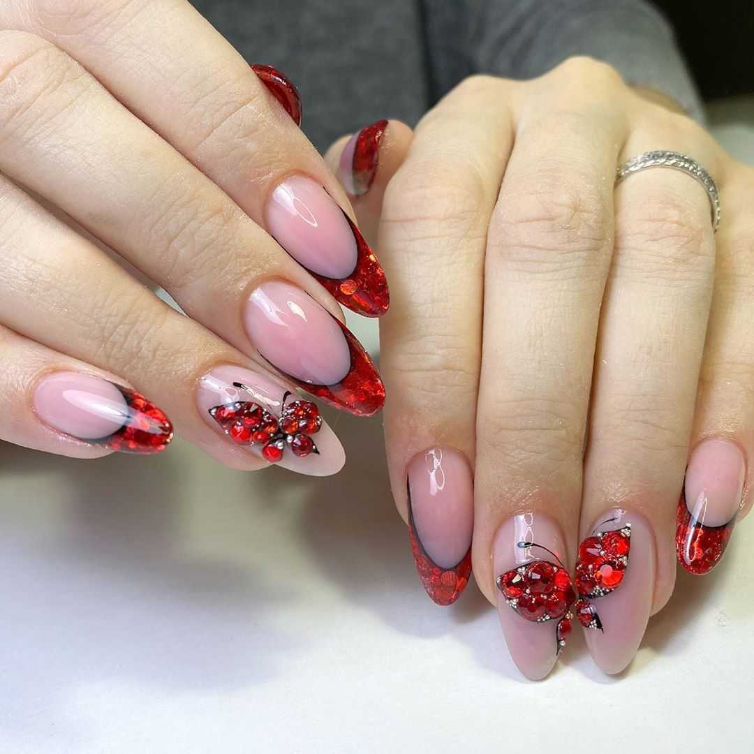 - Блёстки под основание. Нанесите красные блёстки под основной цвет подложки и получите невероятно эстетичное мерцание, которое не оставит равнодушными даже самых придирчивых клиентов;
