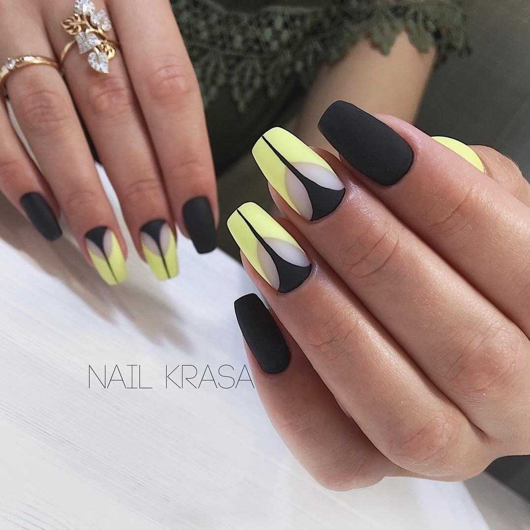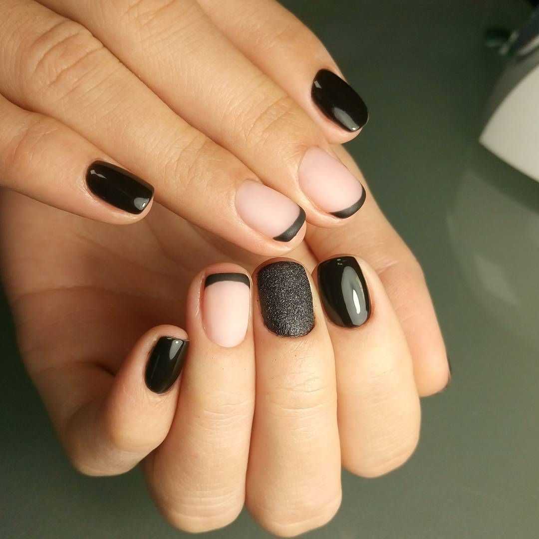 - чёрный глянец на чёрный матовый. Не менее эстетичное и красивое решение, которое придаст ногтям особую эстетику и женственность;