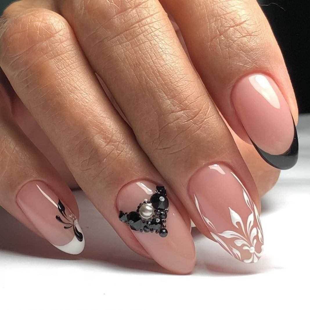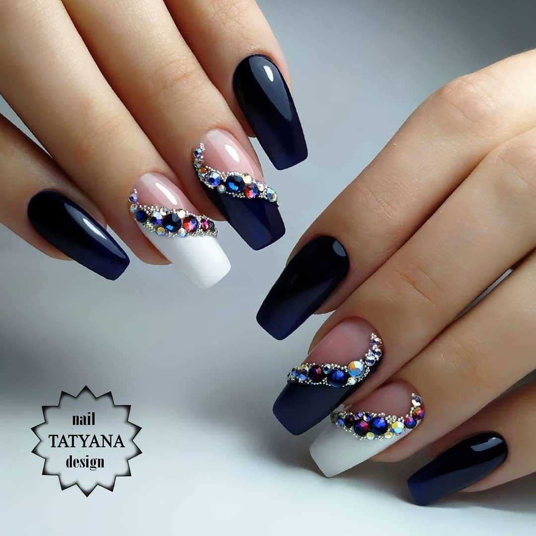 Черный маникюр на длинные ногти хорошо дополнять различными цветовыми акцентами. Темная база универсальная в плане подобных комбинаций. Однако самыми выигрышным является сочетание черного и белого.