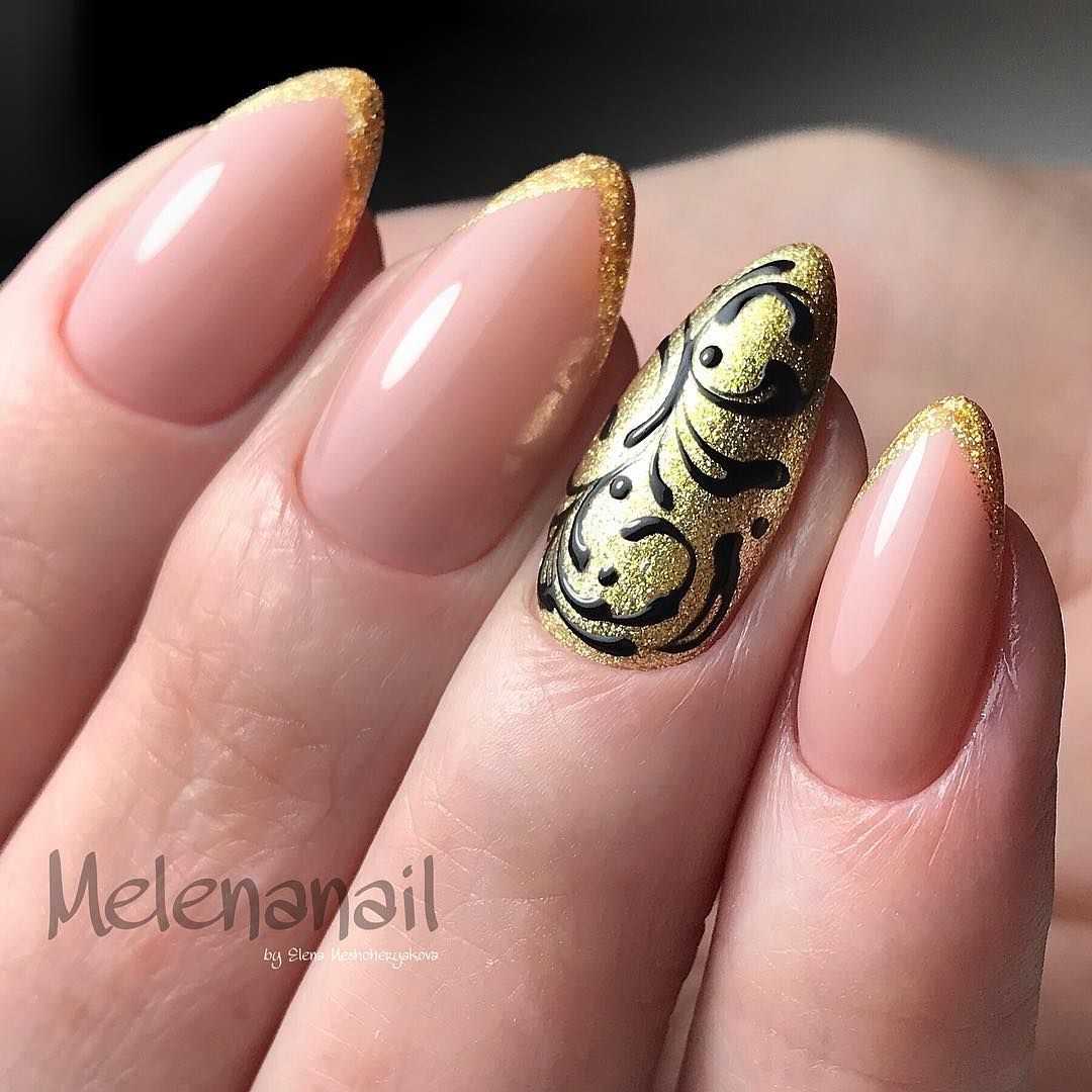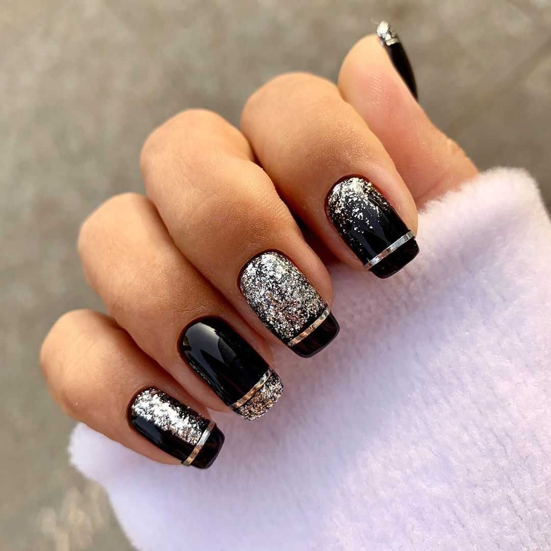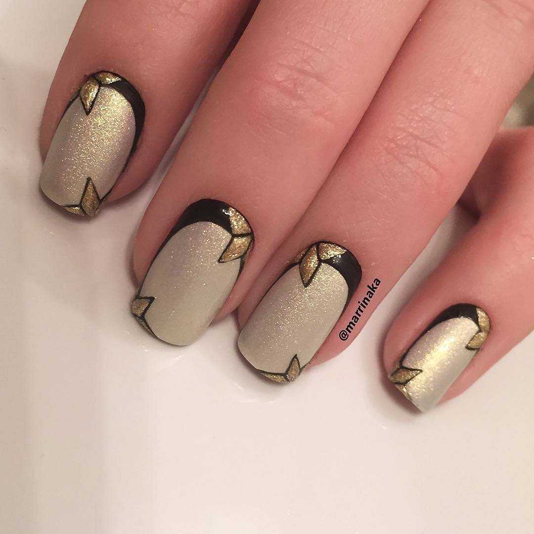 Источник фото: pinterest.ru Чёрный цвет с золотом — это невероятная роскошь, блеск и акцент. Именно поэтому стоит тщательно выбирать технику дизайна, чтобы ваше покрытие смотрелось элегантным и в то же время праздничным.