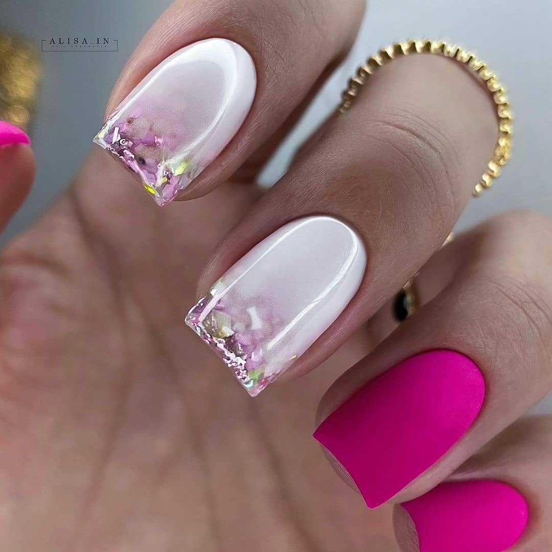 - комбинированный маникюр — это сочетание различных техник нанесения, от минималистичных до выручных, максимально эффектных.