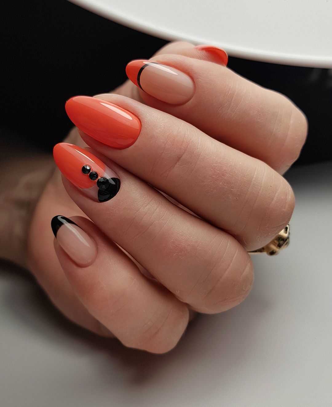 Во французском маникюре нет ограничений. Черный можно смело сочетать с оранжевым солнечным оттенком лака. Только обязательно продумайте как и с чем вы будете “носить” такой дизайн. Оранжевый — достаточно активный цвет для базы. И хотя он несколько уравновесится темным кончиком, все же останется доминирующим.
