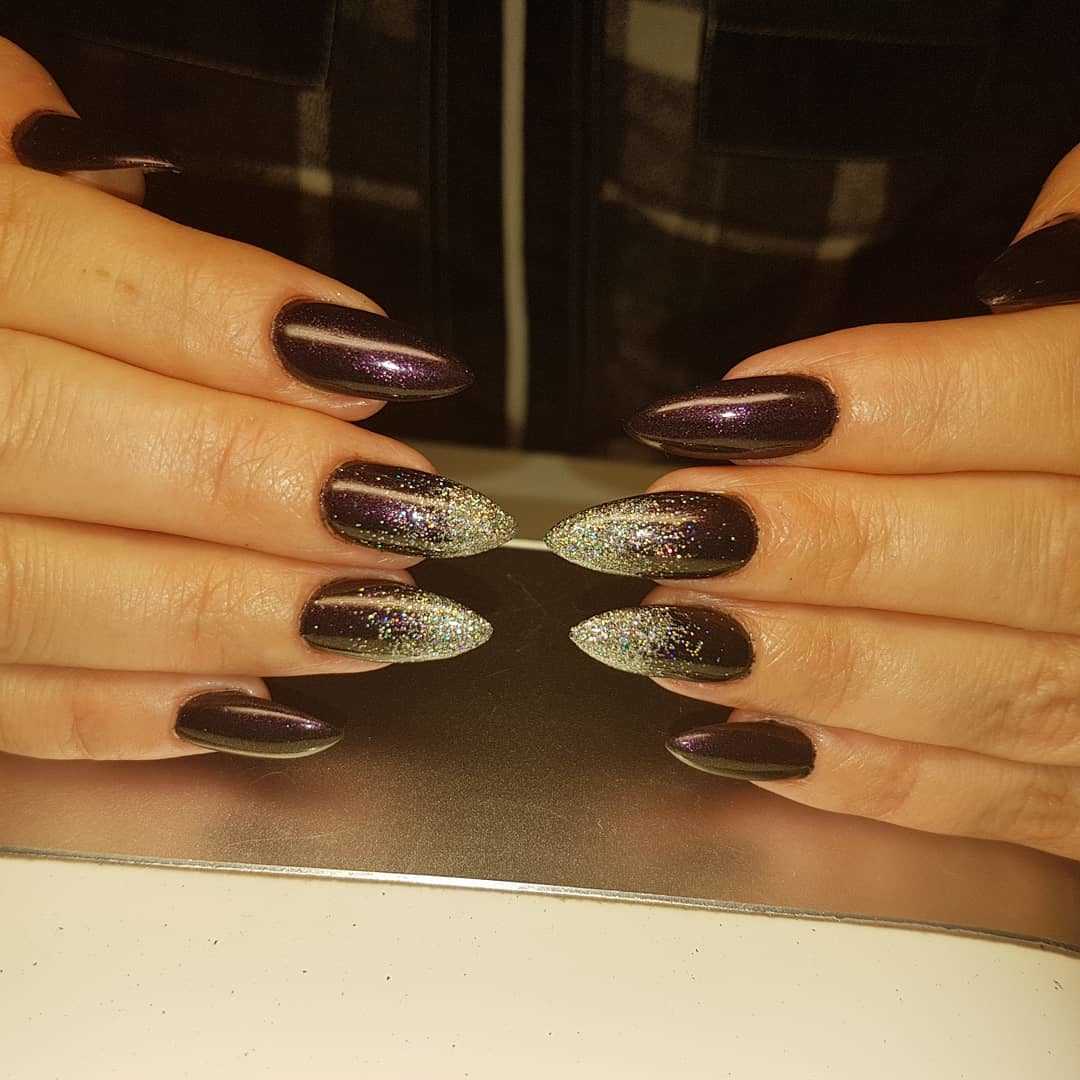 - Здесь же можно применить золотые блёстки, которые будут смешиваться с чёрным гель лаком и создавать эффект «мерцания» на ногте.