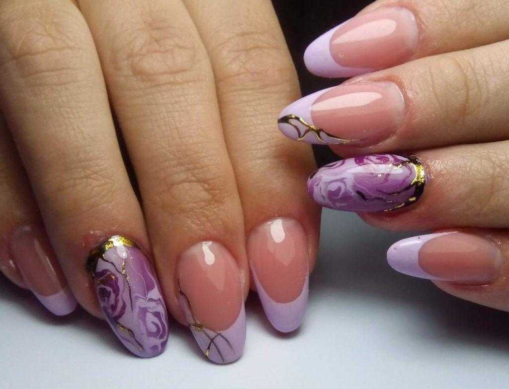 Природные мотивы легко реализуются во французском дизайне с помощью скромных, нежных цветочных узоров или одного крупного цветочного рисунка. Естественность и натуральность присущи мраморной технике в оформлении нескольких ногтей французского маникюра. В моде также символические изображения, абстракция и геометрия, причем в меру и умеренно.