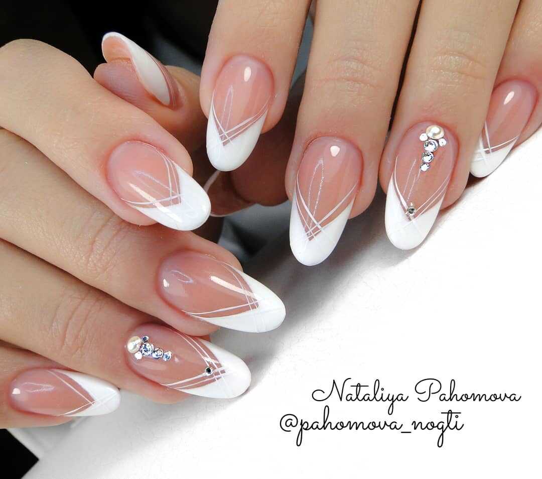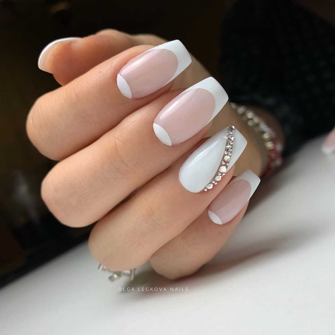 Даже если вы предпочитаете классический белый цвет всем видам французского маникюра, образ можно легко освежить и сделать более модным. Попробуйте обрамить ногти белой скошенной линией или создать на них мраморный эффект.