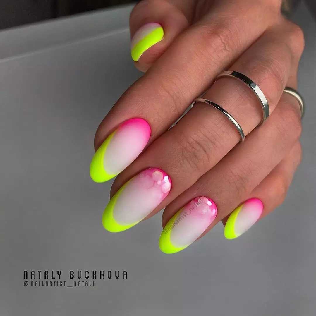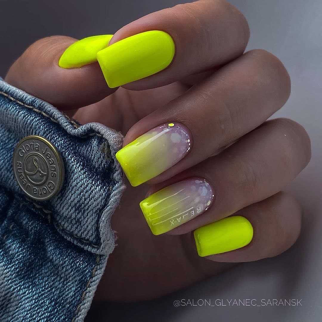 - Неоновый лак смотрится ярко и подойдет для подростков и молодых девушек, мечтающих выделиться из толпы. Действительно хорошо смотрится такой маникюр вместе с пестрой одеждой: яркими юбками, футболками и шортами. К актуальным неоновым оттенкам лаков относят желтый, салатовый, оранжевый, синий и малиновый. Некоторые лаки имеют свойство светиться в темноте. Нам кажется, что это идеальный вариант для лета, которое уже не за горами.
