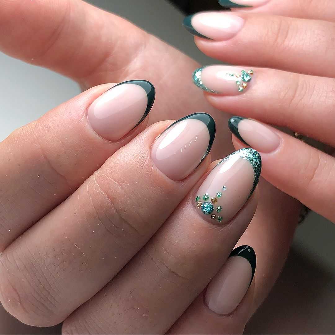 Использование блесток во френче в дизайне маникюра черный с золотом, позволит разнообразить и сделать ваш повседневный маникюр более ярким и праздничным. Предлагаем несколько вариантов покрытия для ярких и праздничных моментов: