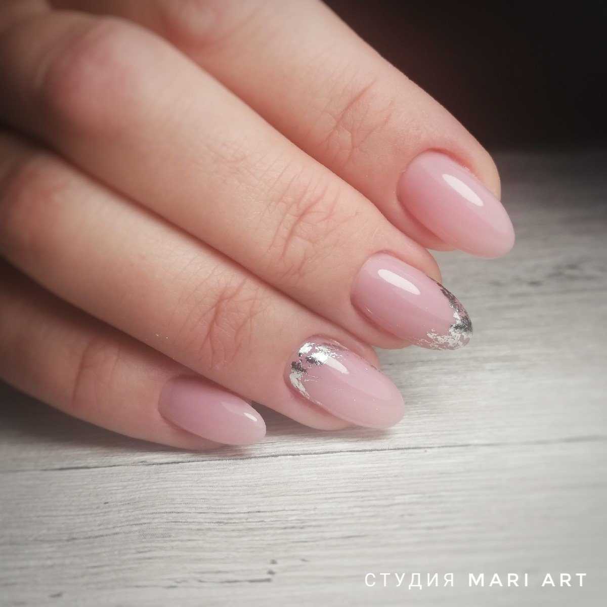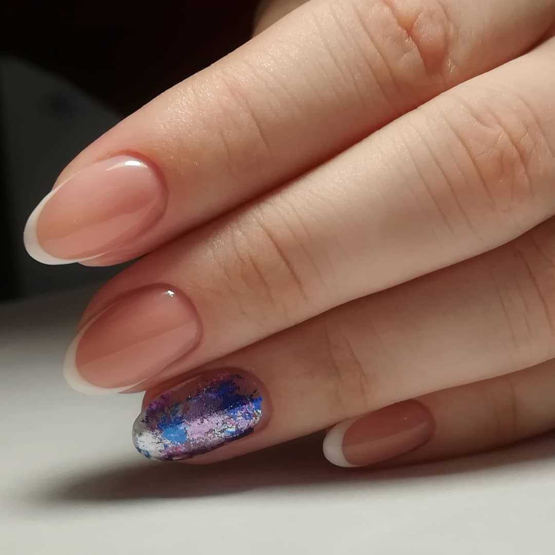 Если посмотреть на короткие ногти, представленные на фото, то можно увидеть дизайн, выполненный фольгой. Зеркальная пленка буквально растворилась на кончике пальца. Она выглядит потрясающе, словно погруженная под слои полимера. Расположение узора происходит только на одном из пальцев, образуя единую, гармоничную композицию.