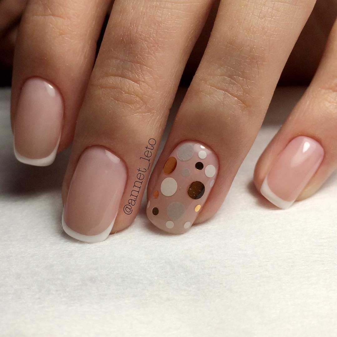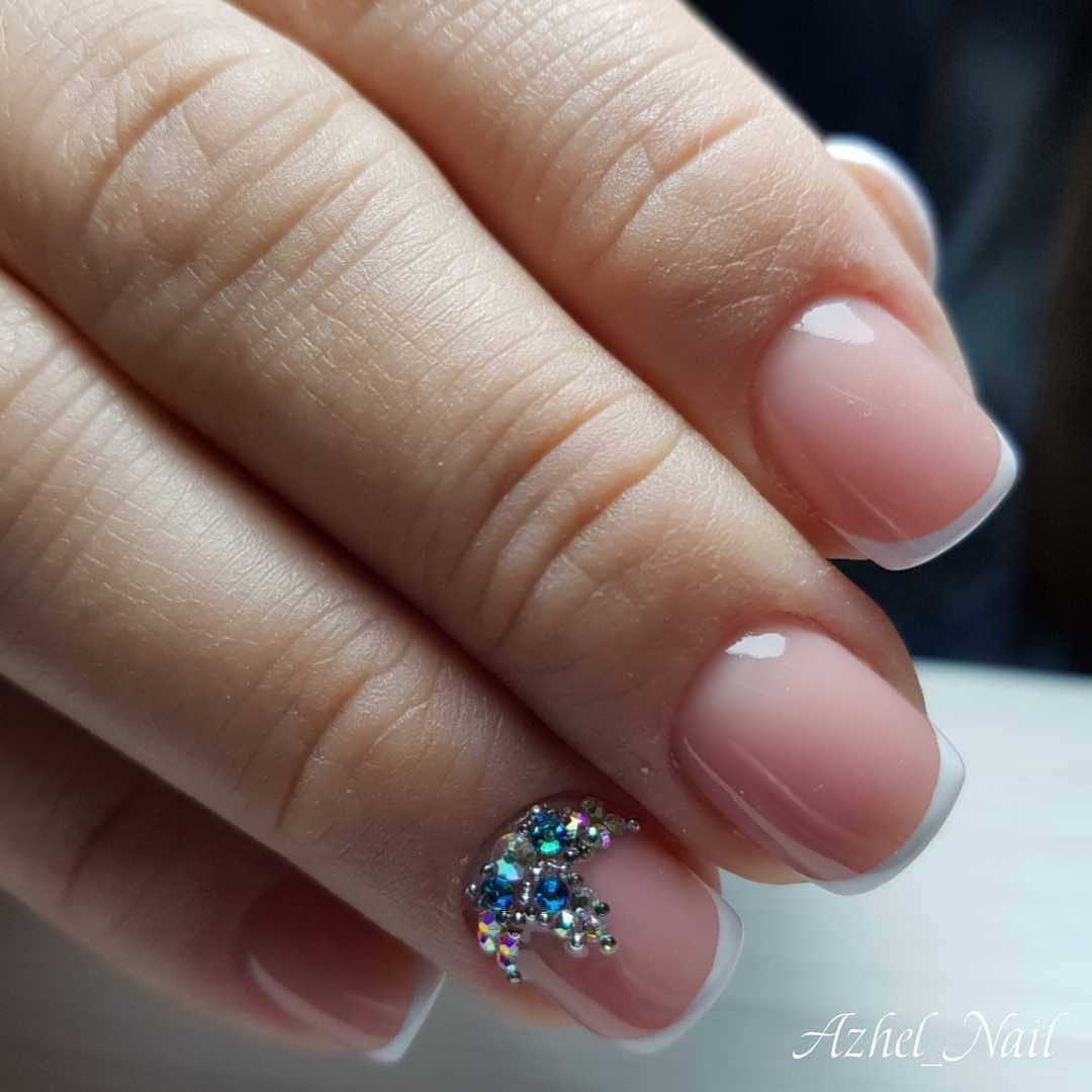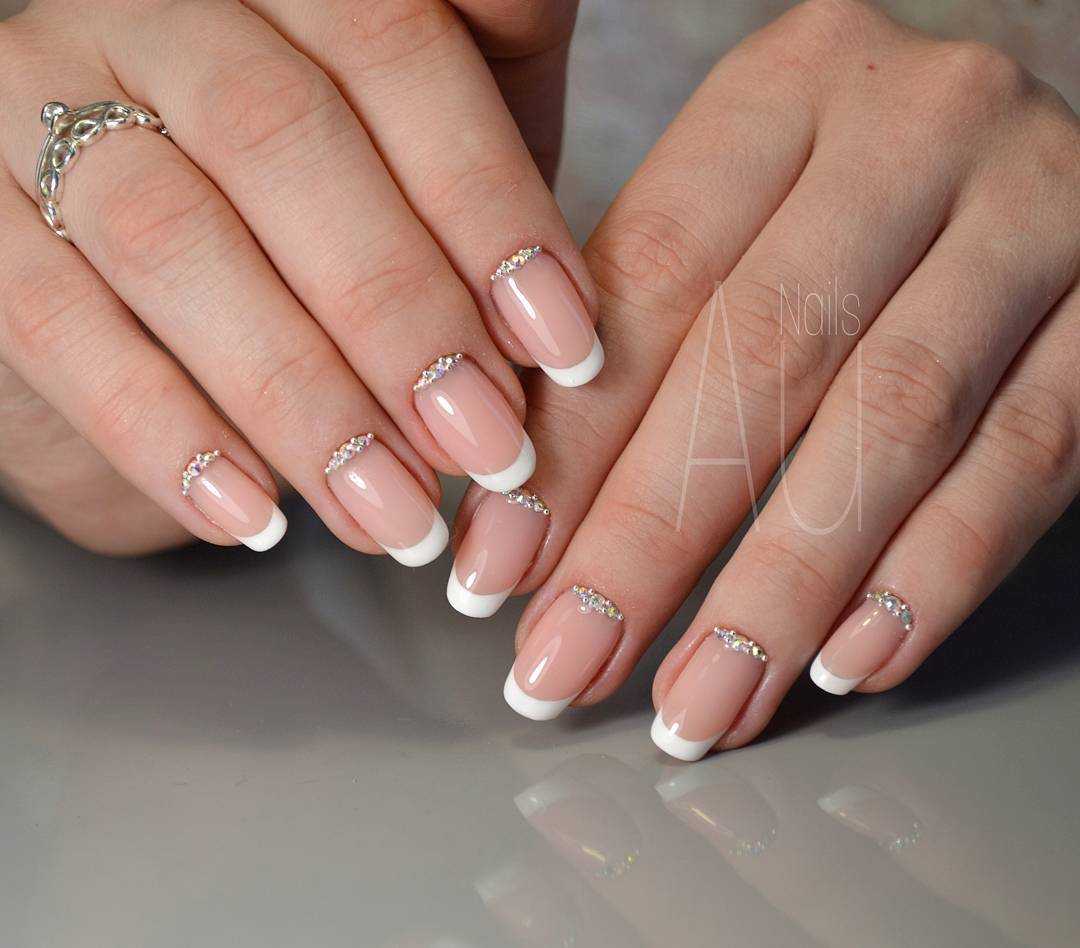 Короткие ноготки достойны украшения французским маникюром. Самый уместный дизайн – обозначение контрастным цветом кончиков ногтевой пластины. Допустим точечный мелкий блестящий декор в виде страз.