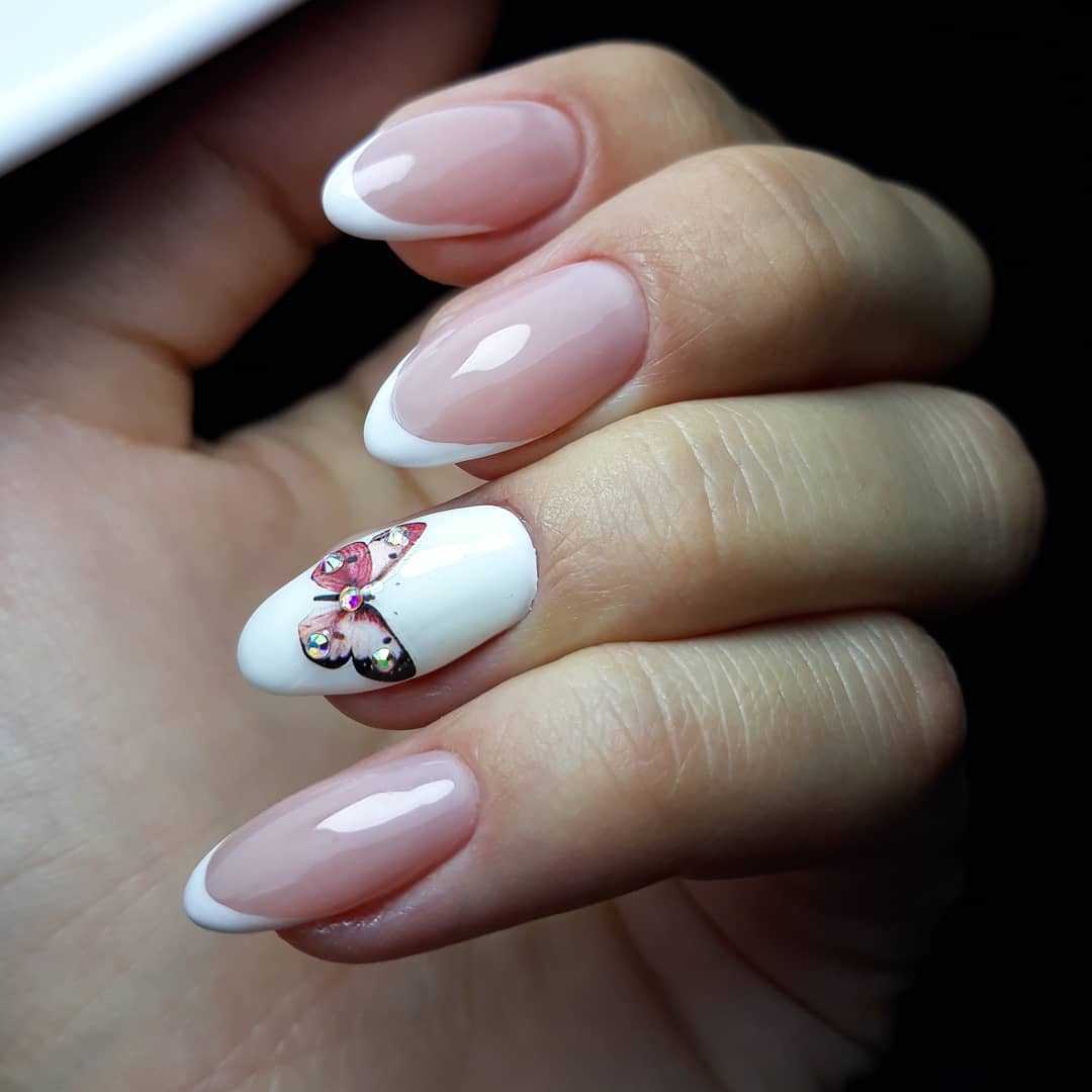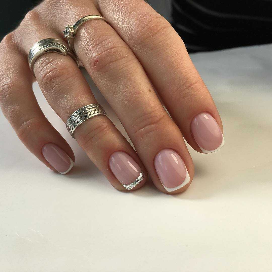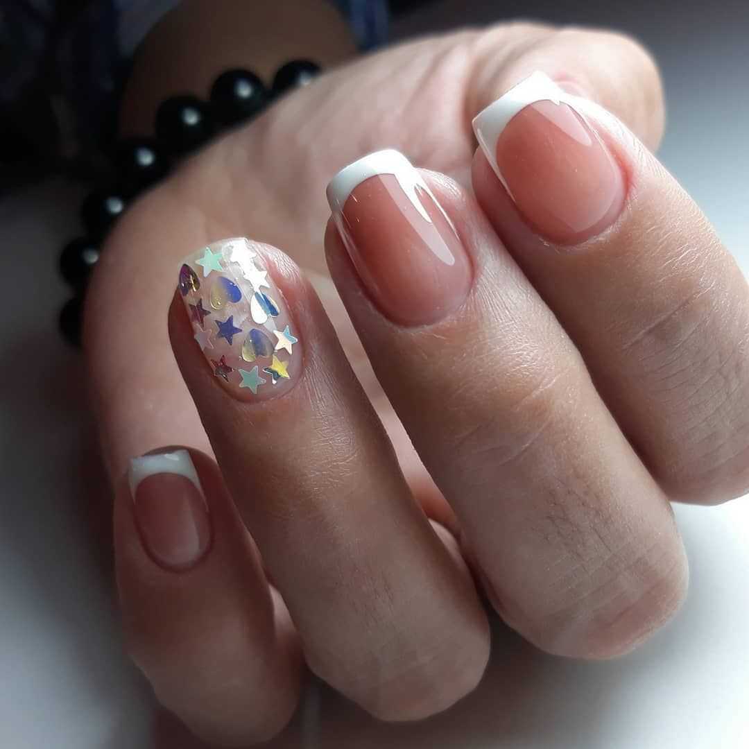 Короткие ноготки достойны украшения французским маникюром. Самый уместный дизайн – обозначение контрастным цветом кончиков ногтевой пластины. Допустим точечный мелкий блестящий декор в виде страз.