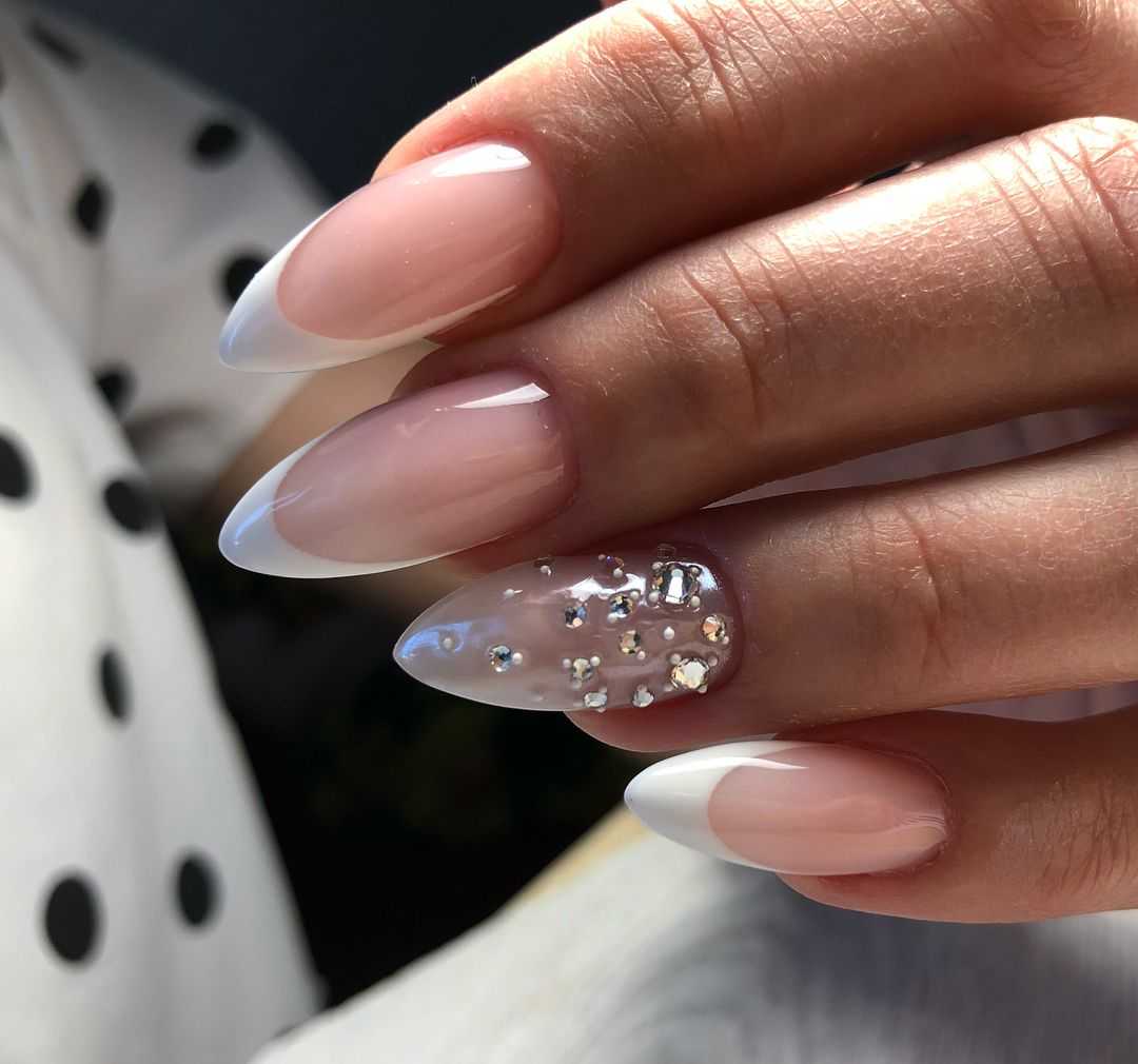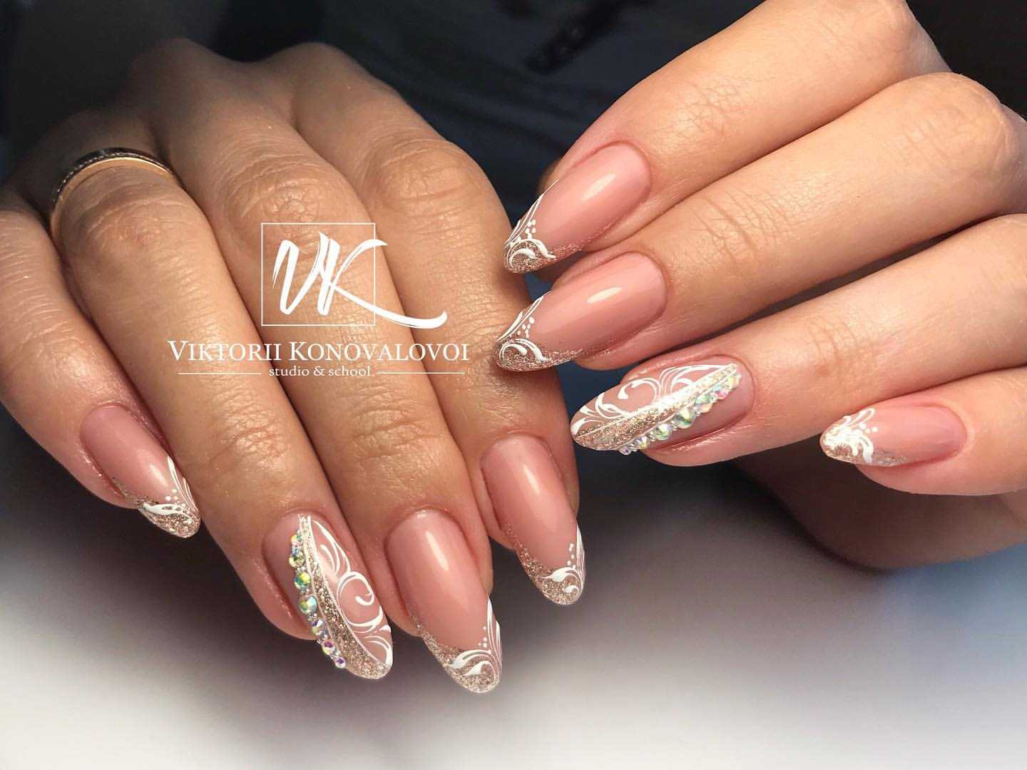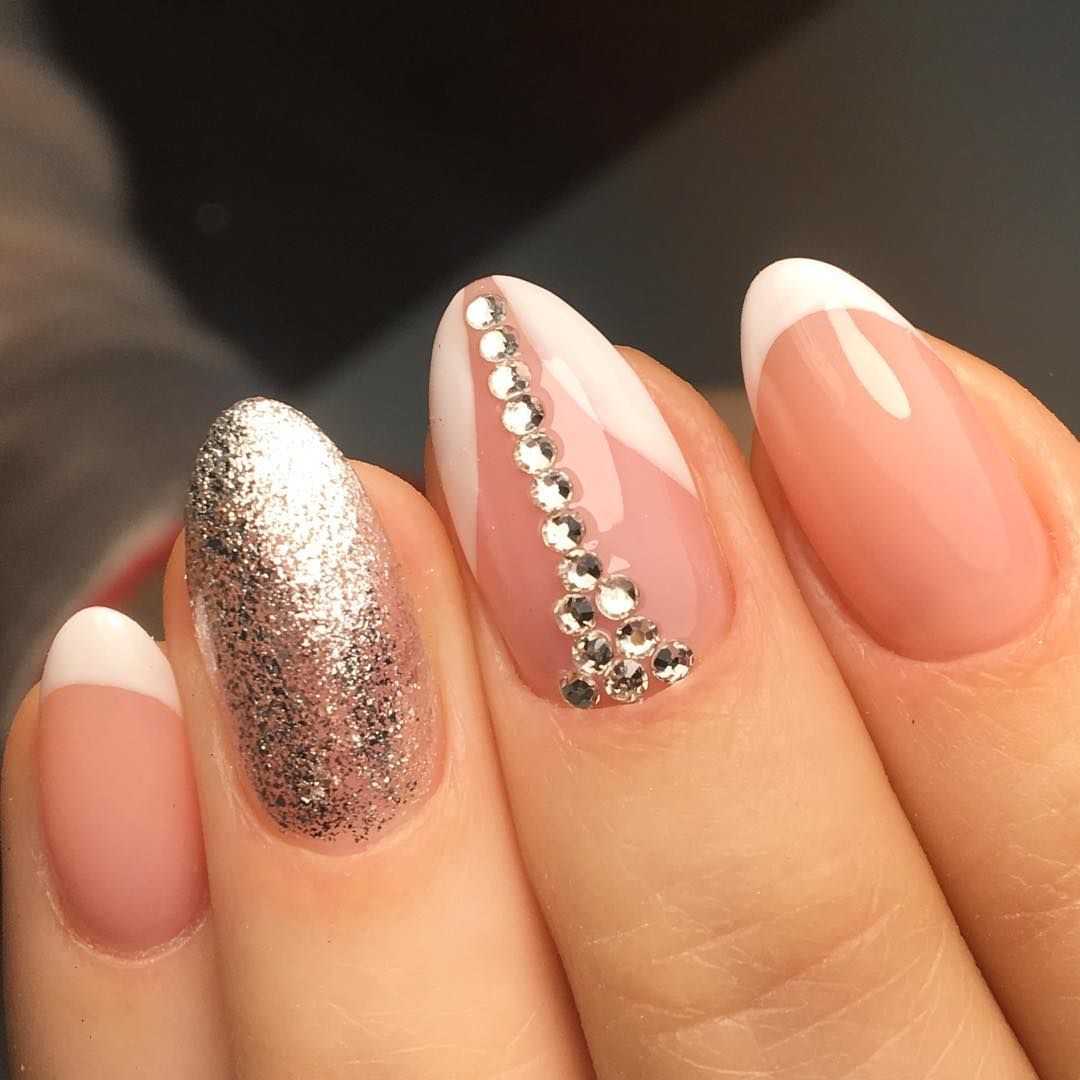 - Острый френч цвета какао с блёстками и омбре к белому цвету. Рисунки стразами располагаются в середине одного из ногтей или у основания лунного маникюра.