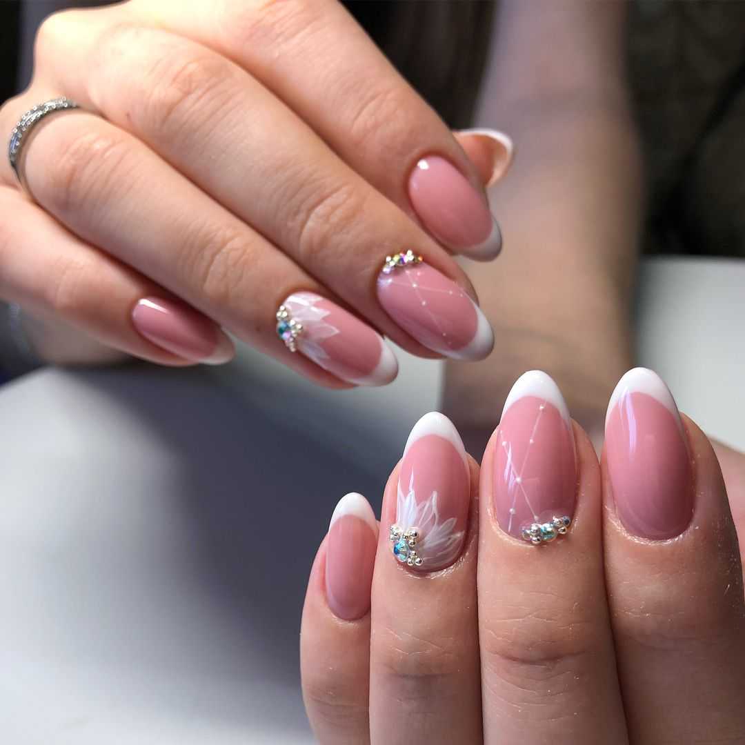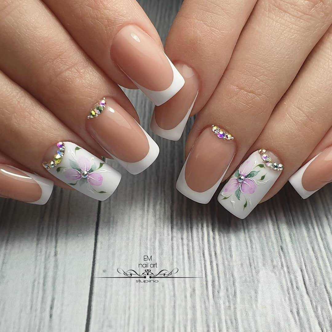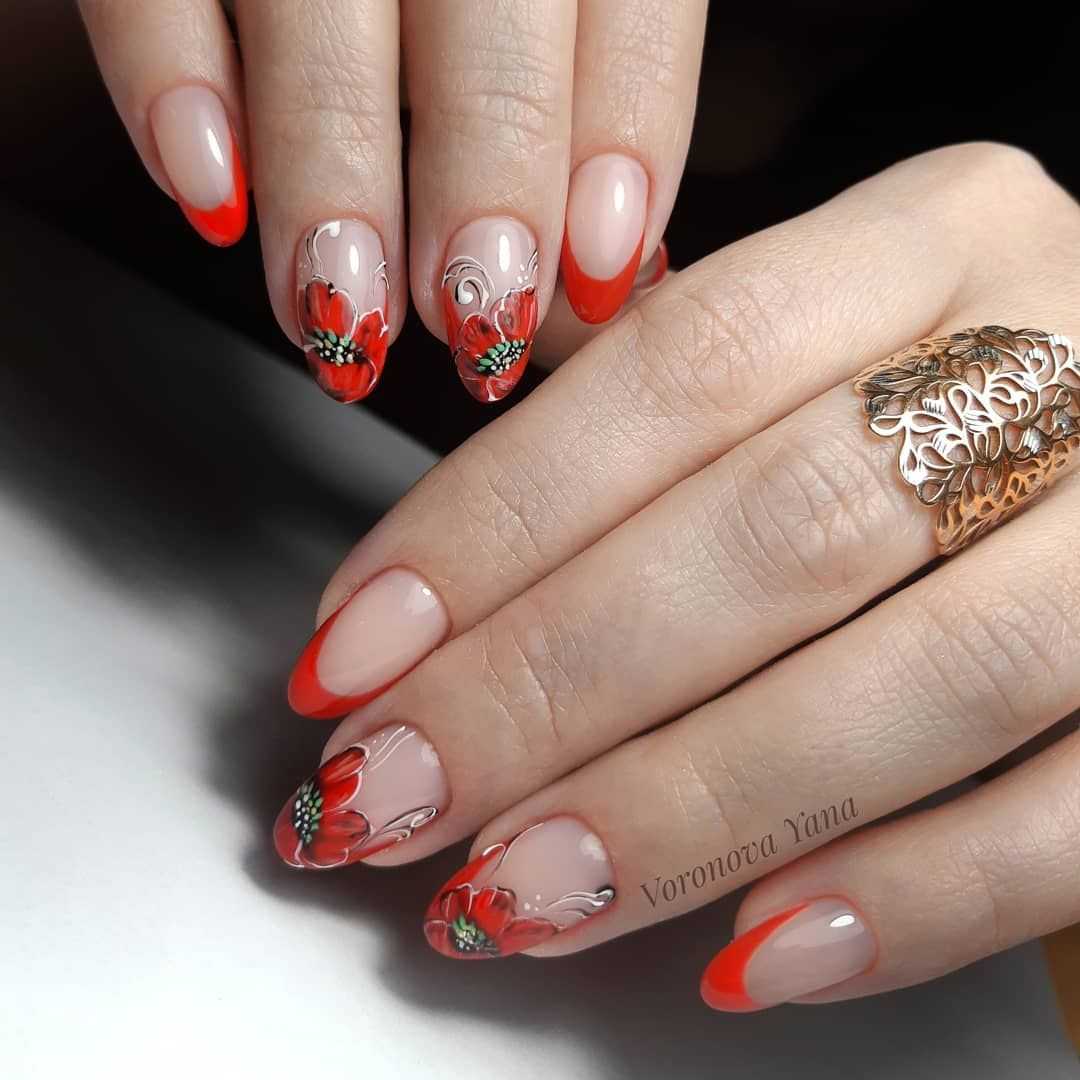 Как раз цветочный рисунок, френч и лунный узор используется на разную длину ноготков. Все зависит от выбранной формы.