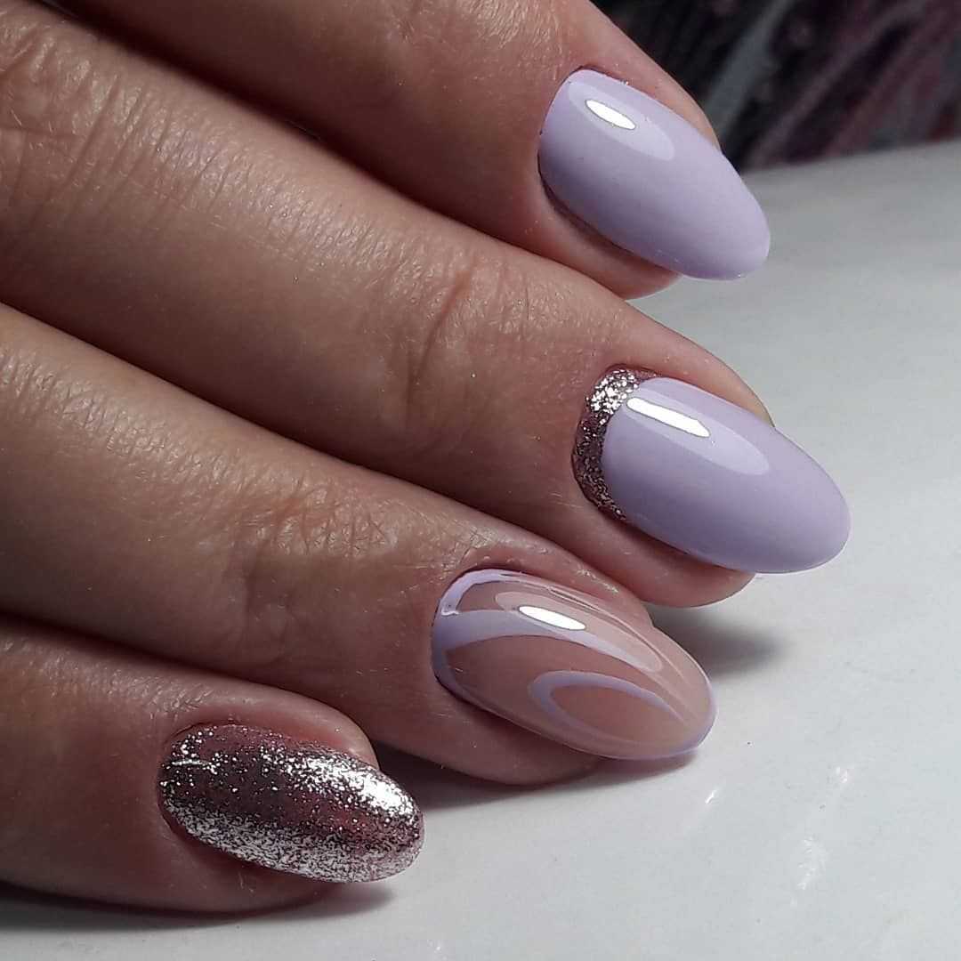 - Сиреневый выкладной френч с блестящими рыбками у основания ногтей или пальмами.