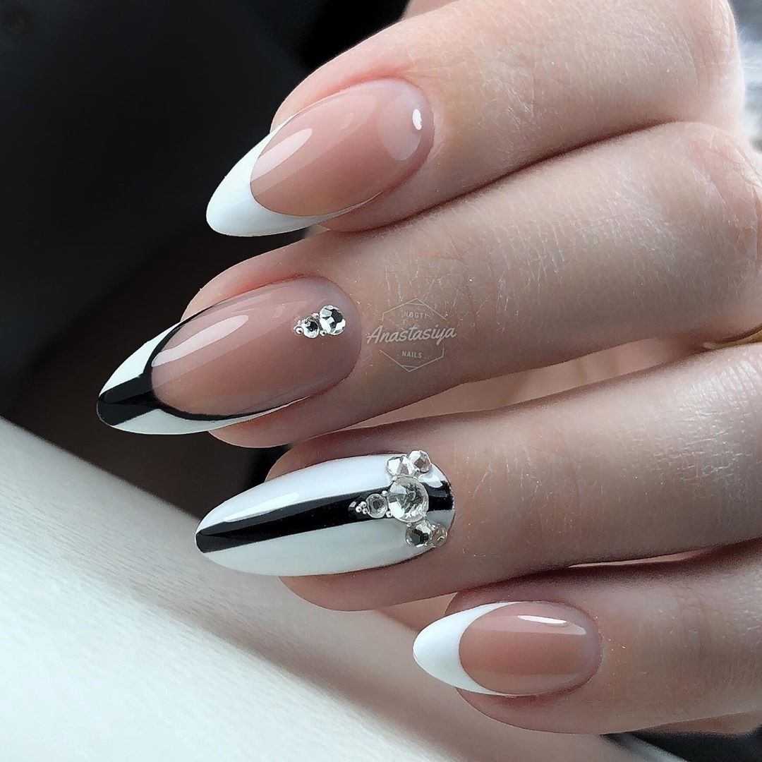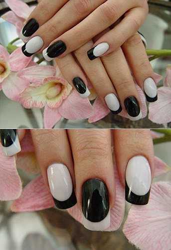 Белый френч в сочетании с черным смотрится элегантно, изыскано. Белый фон проявляет черную улыбку и наоборот. Маникюр черно белый уместен для офиса и вечеринки. Ярко выделяются на белом темные вензеля, завитушки со стразами, рельефные рисунки. Идея — контраст черного и белого. Игра противоположностей дает интересные результаты. Безупречно смотрится угольно-белое рельефное оформление ногтей.