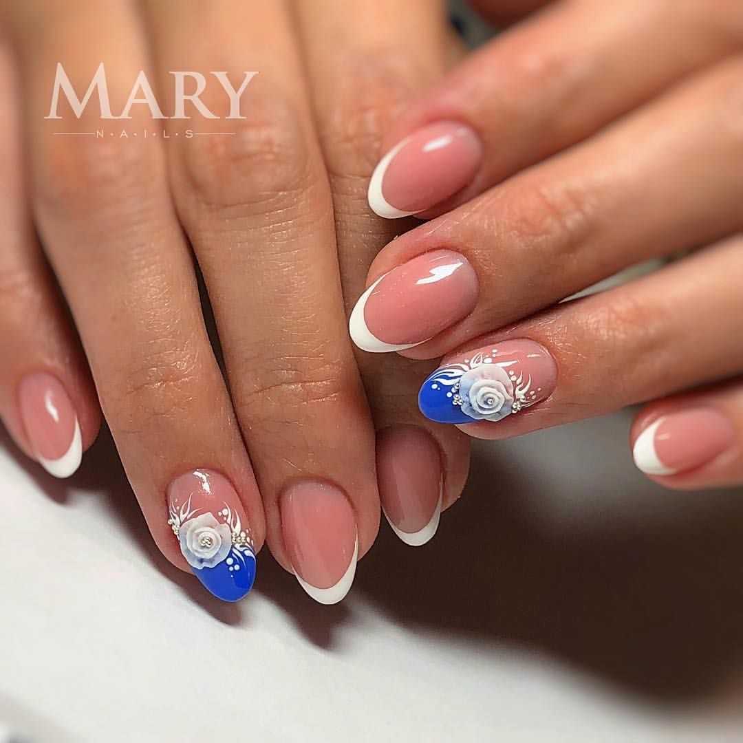 Летом используется сочетание синего выкладного френча с бежевой основой и рисунком ракушки или морской звезды у основания ногтя. Он создаёт летнее настроение и сочетается красиво с джинсовой одеждой. Кроме того, актуален акварельный маникюр френч с прозрачными синими блёстками, напоминающими воду. Такой маникюр всегда будет смотреться актуально, современно и смело.
