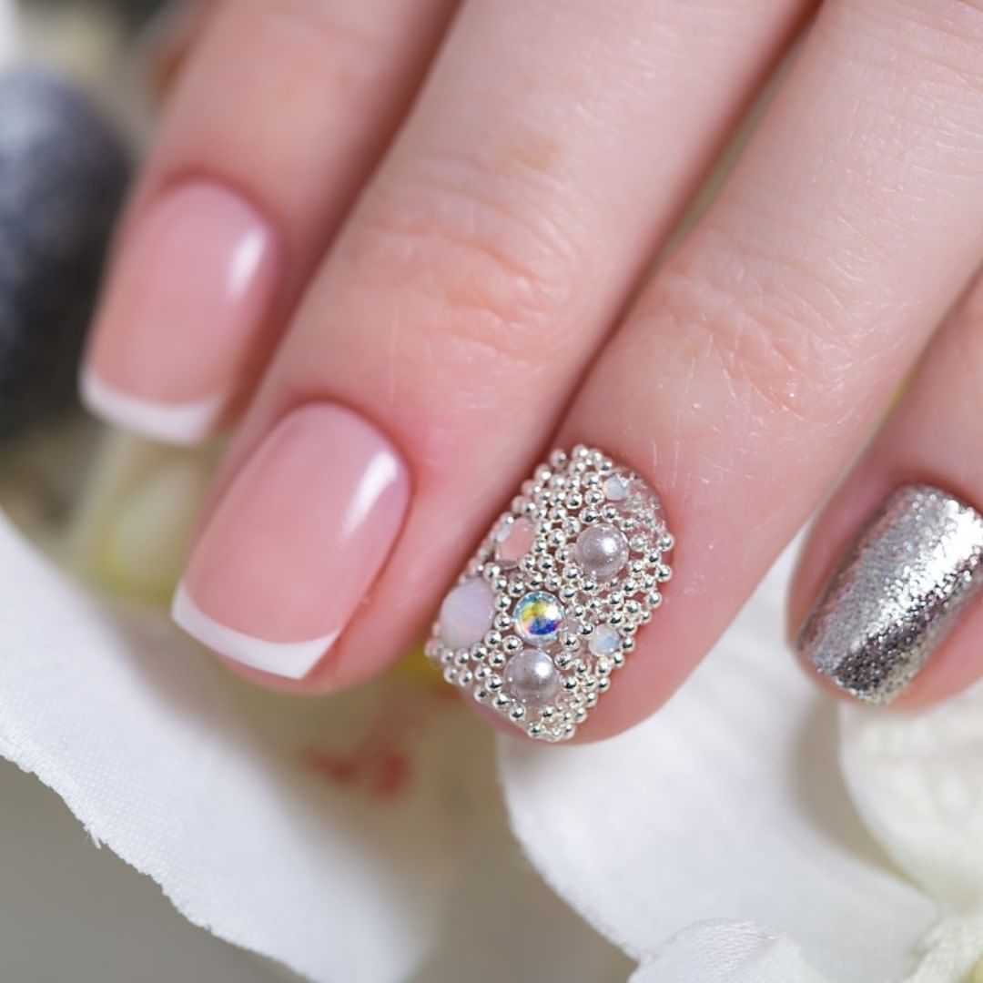 Среди направлений для свадебного дня рассматривают оформление в стиле миллениум, где френч выполняется с применением хрустальной крошки. Мерцающие частички буквально растворяются в покрытии, создавая легкое сияние на красивой улыбке.
