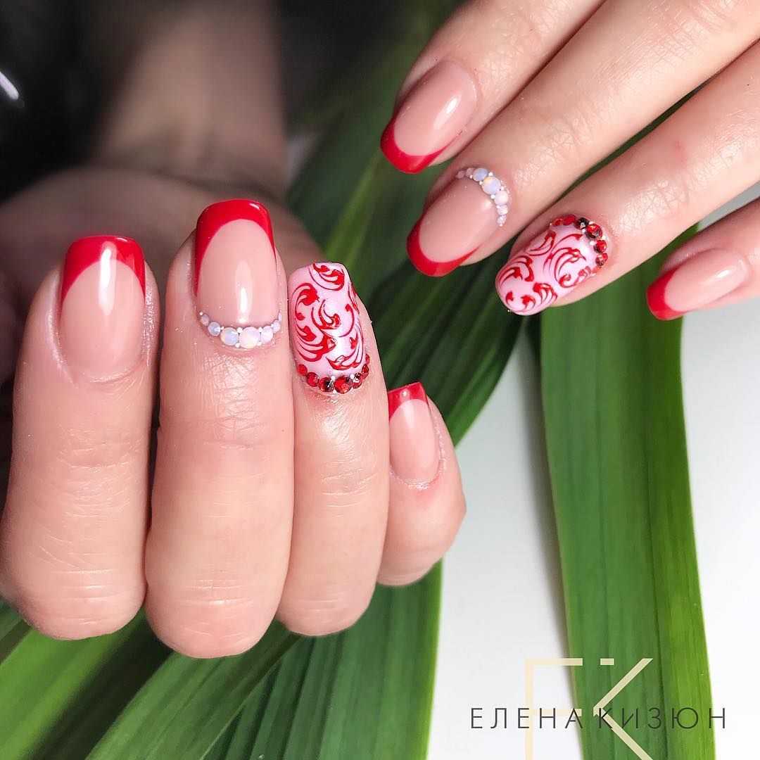 Красный френч маникюр стал наиболее востребованным среди девушек, они выбирают имеющую заостренную форму. Обусловлено это тем, что пальчики становятся изящными, имеют утонченный, ухоженный и аккуратный вид.