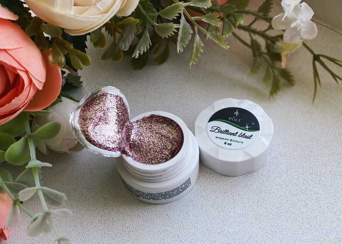 он не просохнет. Топ будет сильно растекаться. А вот густая каучуковая база — самое то. После того, как вы приложили кусочки фольги, сильно давить на них не нужно. Самый идеальный вариант материала для выполнения маникюра жидкий металл — это прозрачная густая гель-краска.