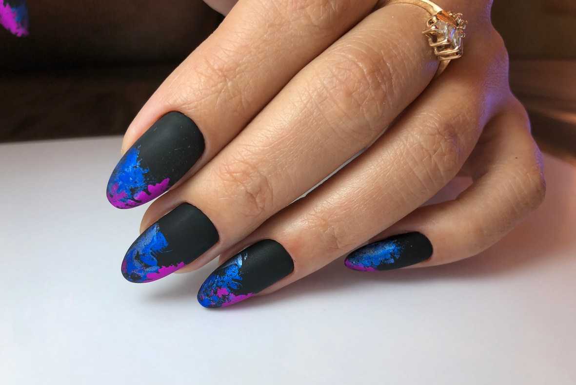 Можно сделать классический матовый нейл-арт, а фольгой покрыть один-два ногтя. Рисунками покрывают все ногтевые пластины или выборочно. Узоры могут быть разными. Кто-то отдает предпочтение абстрактным рисункам, а кто-то выбирает изысканные цветочные узоры.