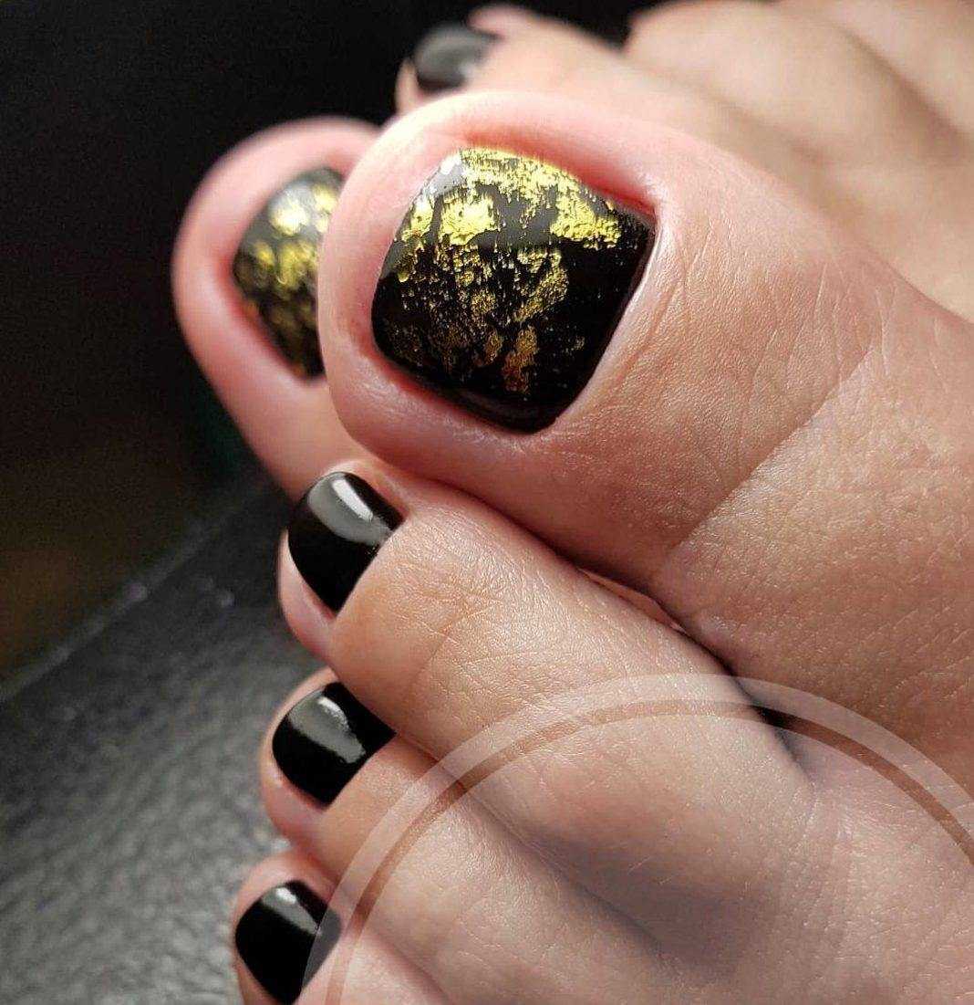 - черный педикюр с золотой фольгой