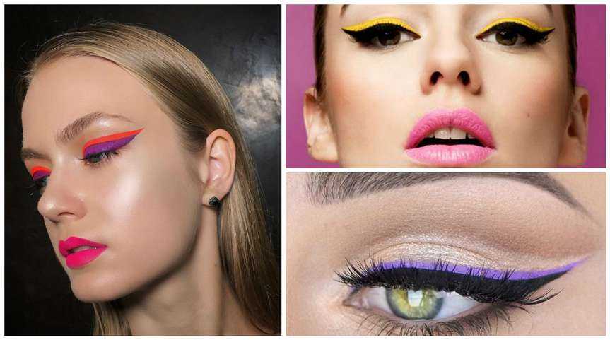 Многоцветные, кислотно-яркие стрелки на веках – хит этого сезона. Особенной любовью пользуется изумительный, сияющий оттенок синего, электрик. Такие стрелки органично сочетаются с традиционной черной подводкой, наносятся в два-три ряда, или используются в моно-варианте.