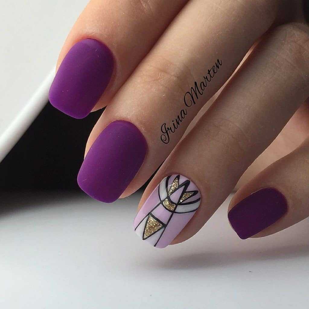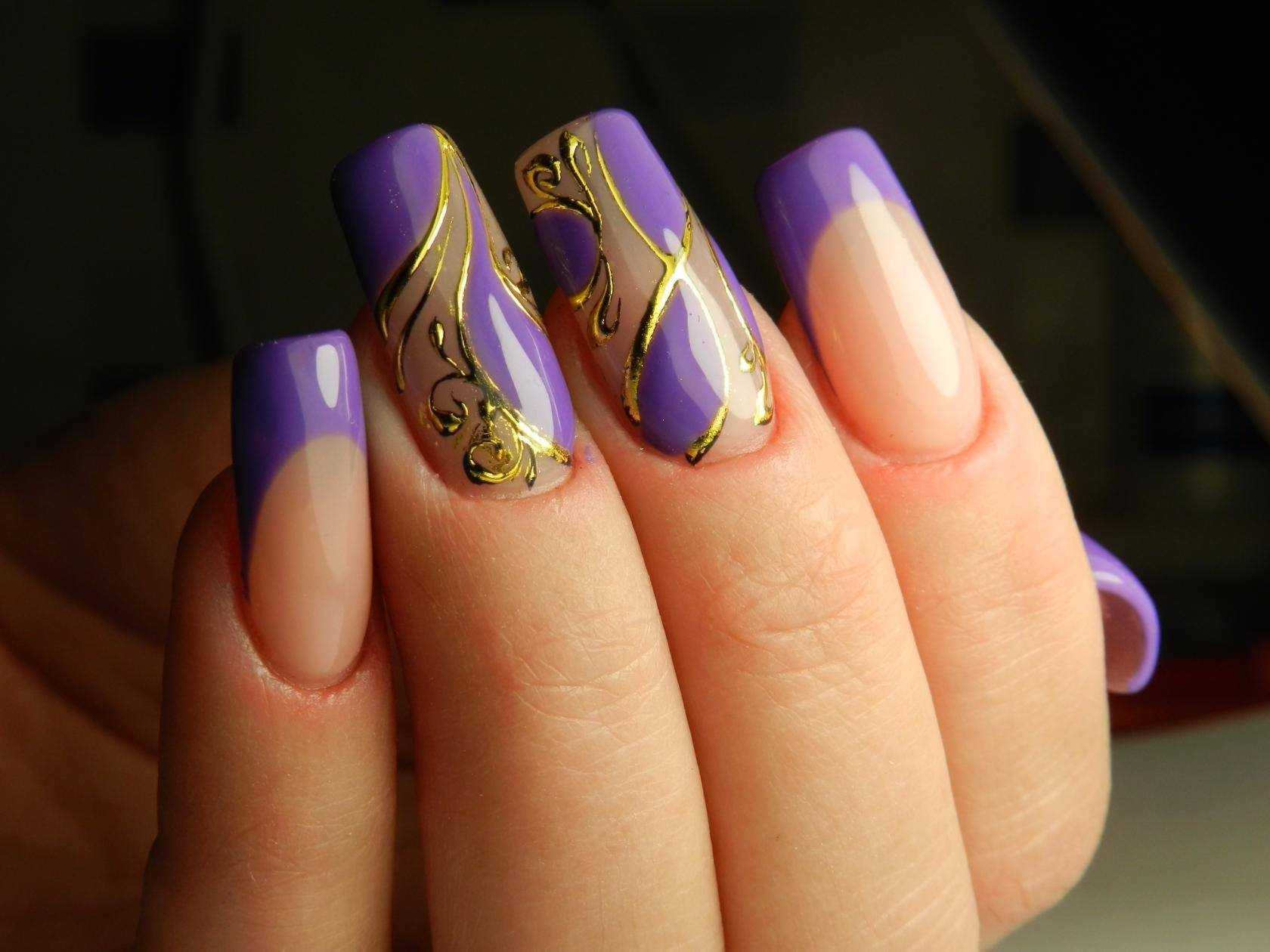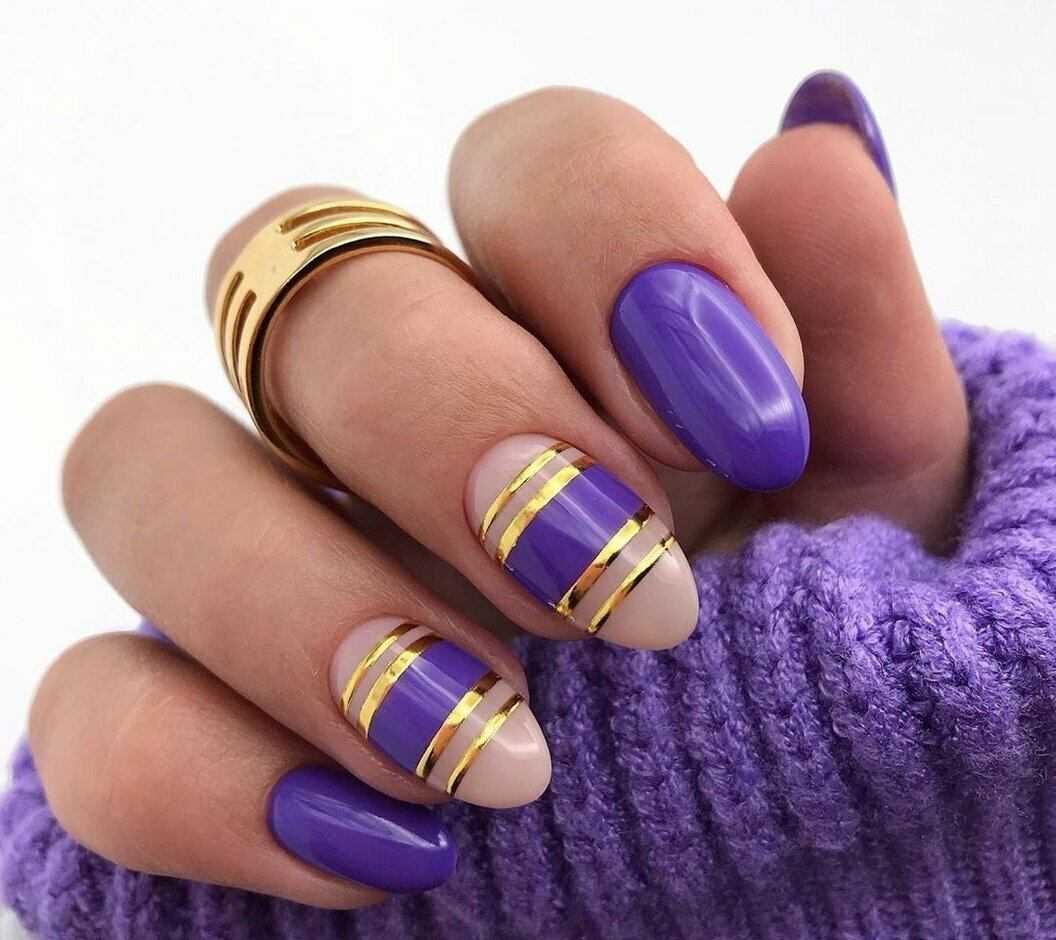 Не стоит отказываться от золотого декора. Жидкий драгоценный металл всегда выгодно смотрится на ноготках. Стоит помнить, что золотой больше подходит к темным вкусным оттенкам фиолетового: сливовому, лиловому, виноградному, пурпурному.