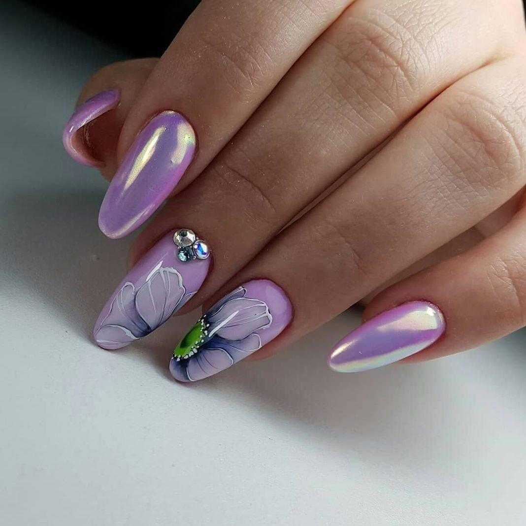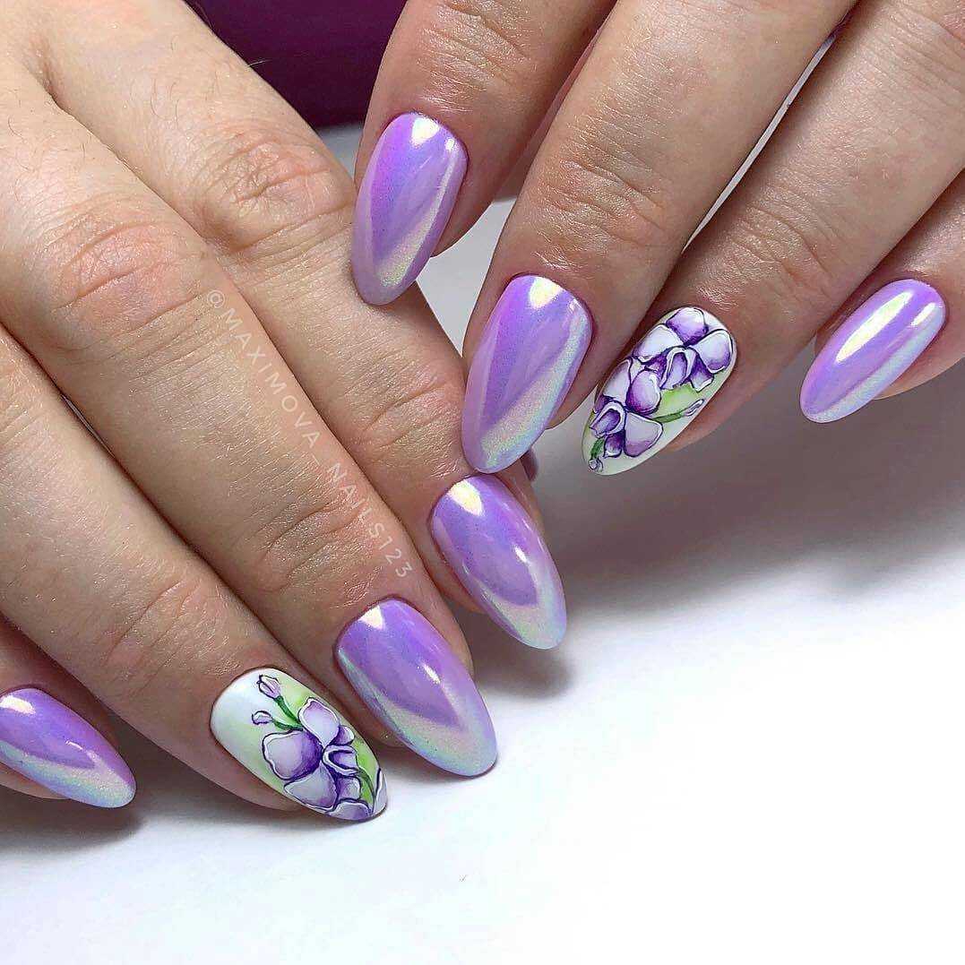 На длинные ногти хороши любые тона сиреневого. Часто используют матовое и глянцевое покрытие. Среди популярных эффектов значатся жемчужный, хамелеоновый, голографический, «кошачий глаз». Хорошо выглядит втирка, создающая особенную игру оттенков.