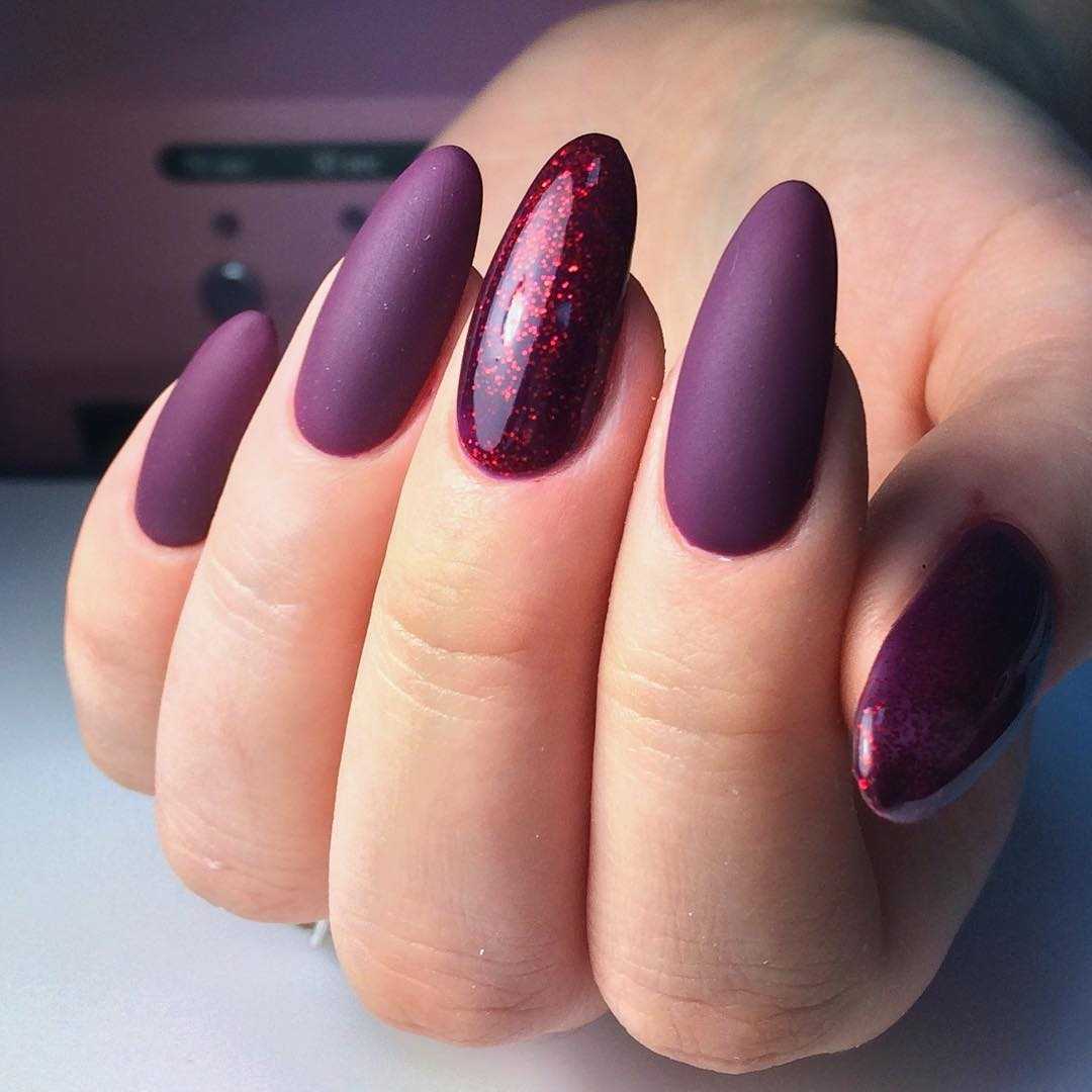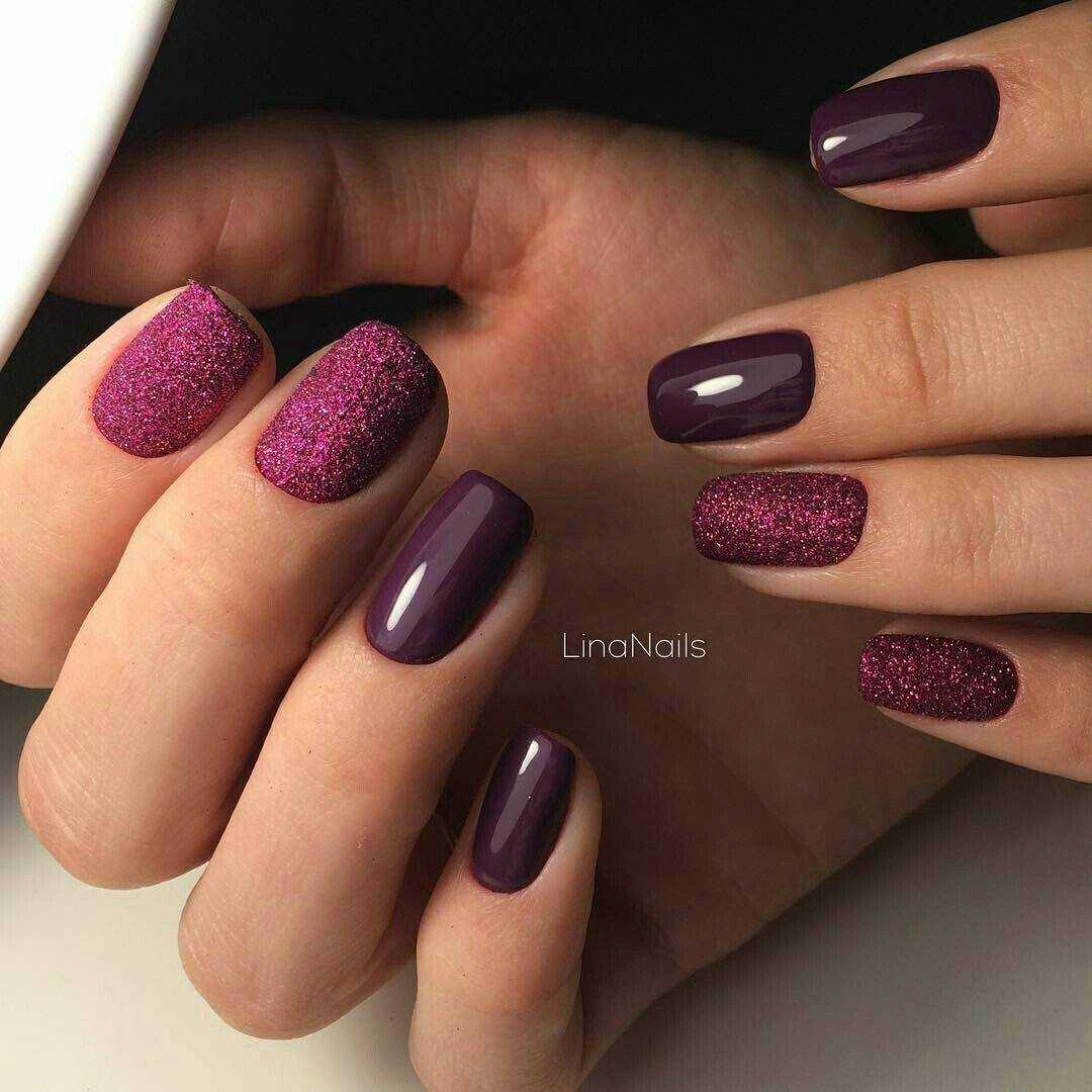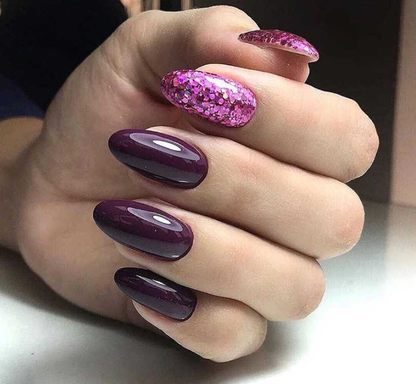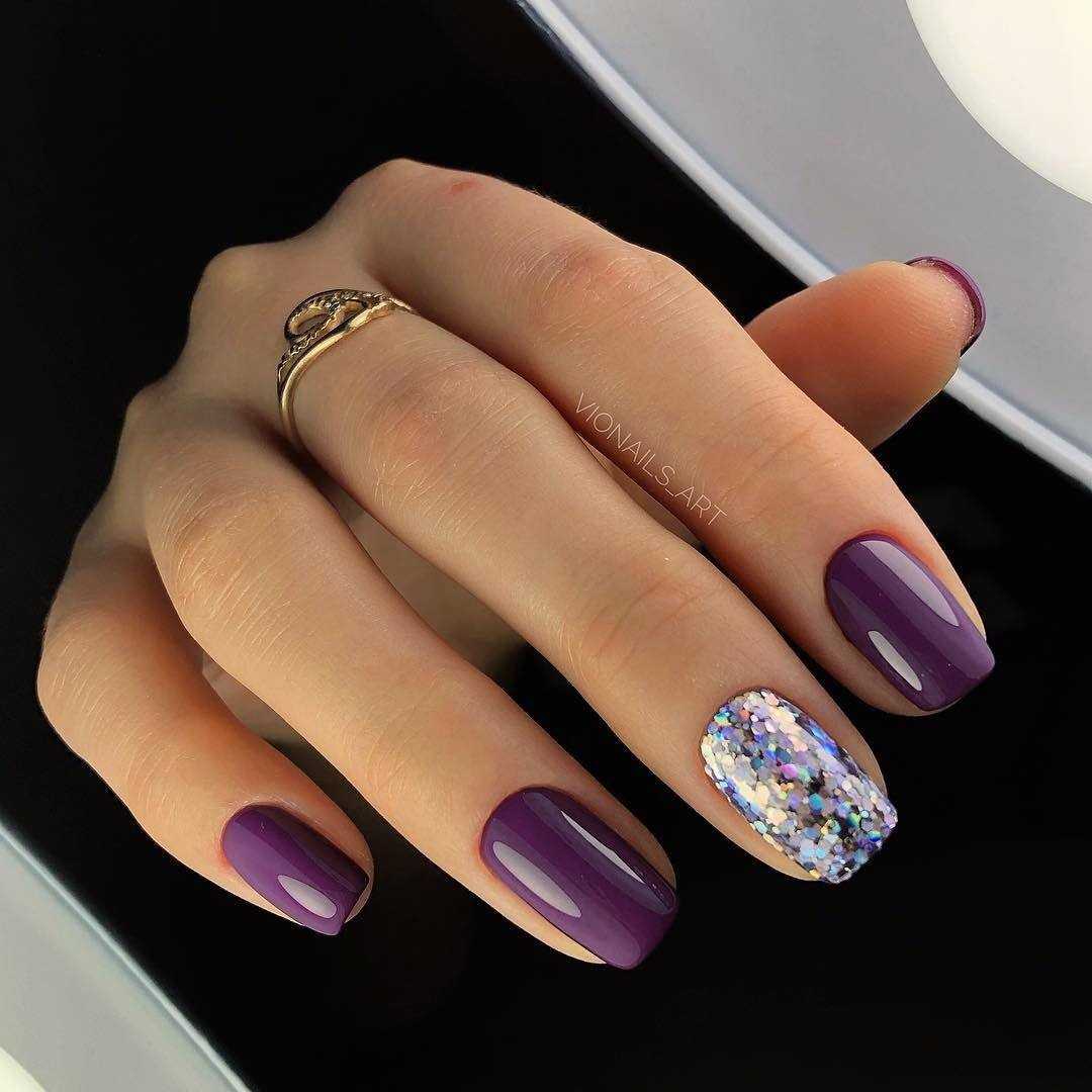 При создании загадочного и выразительного образа интересным решением будет сочетание темно-фиолетового лака с добавлением золотистых или серебряных блесток.