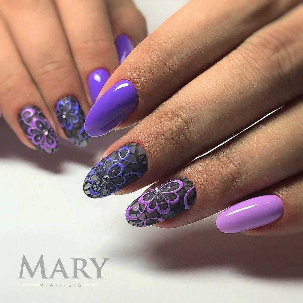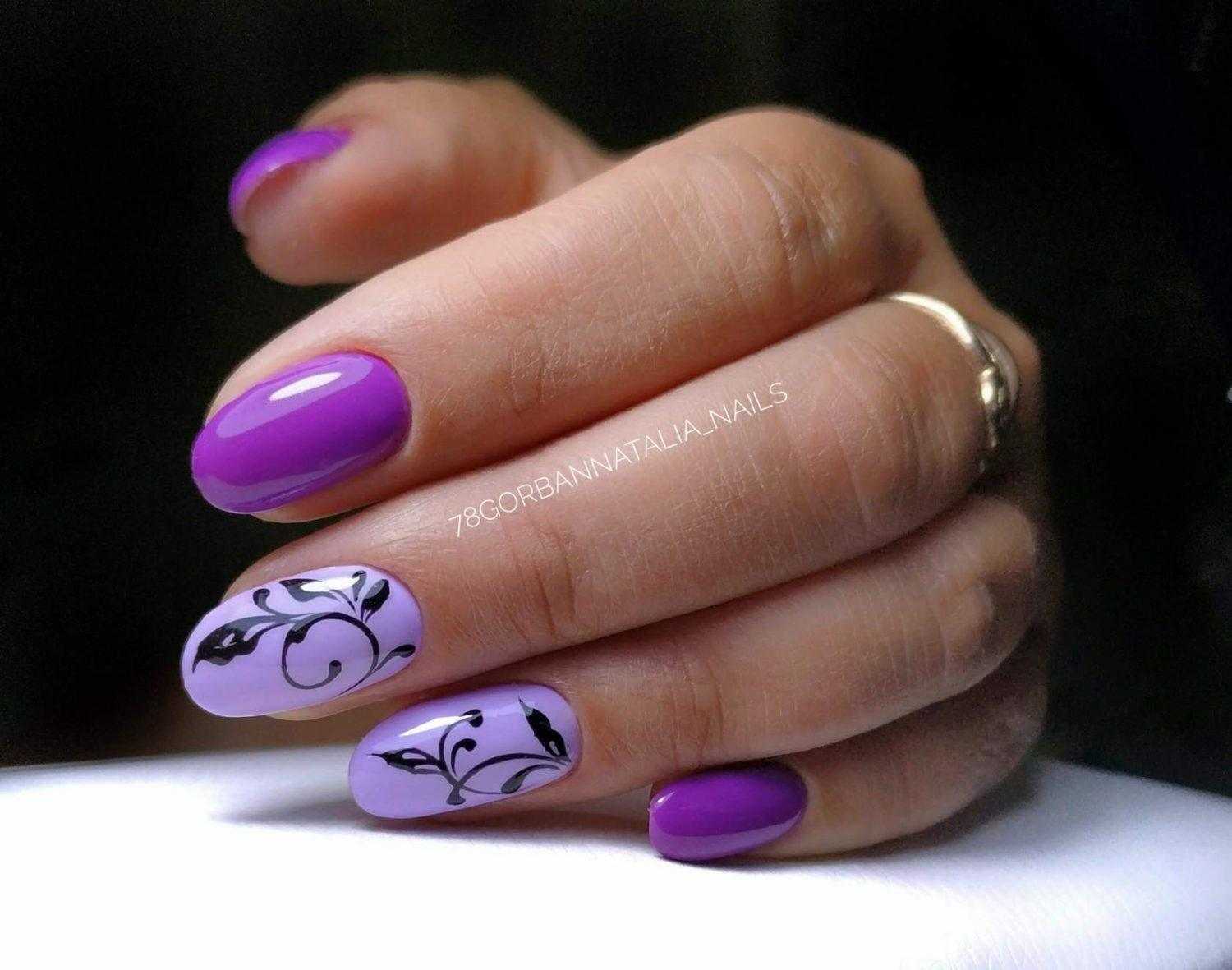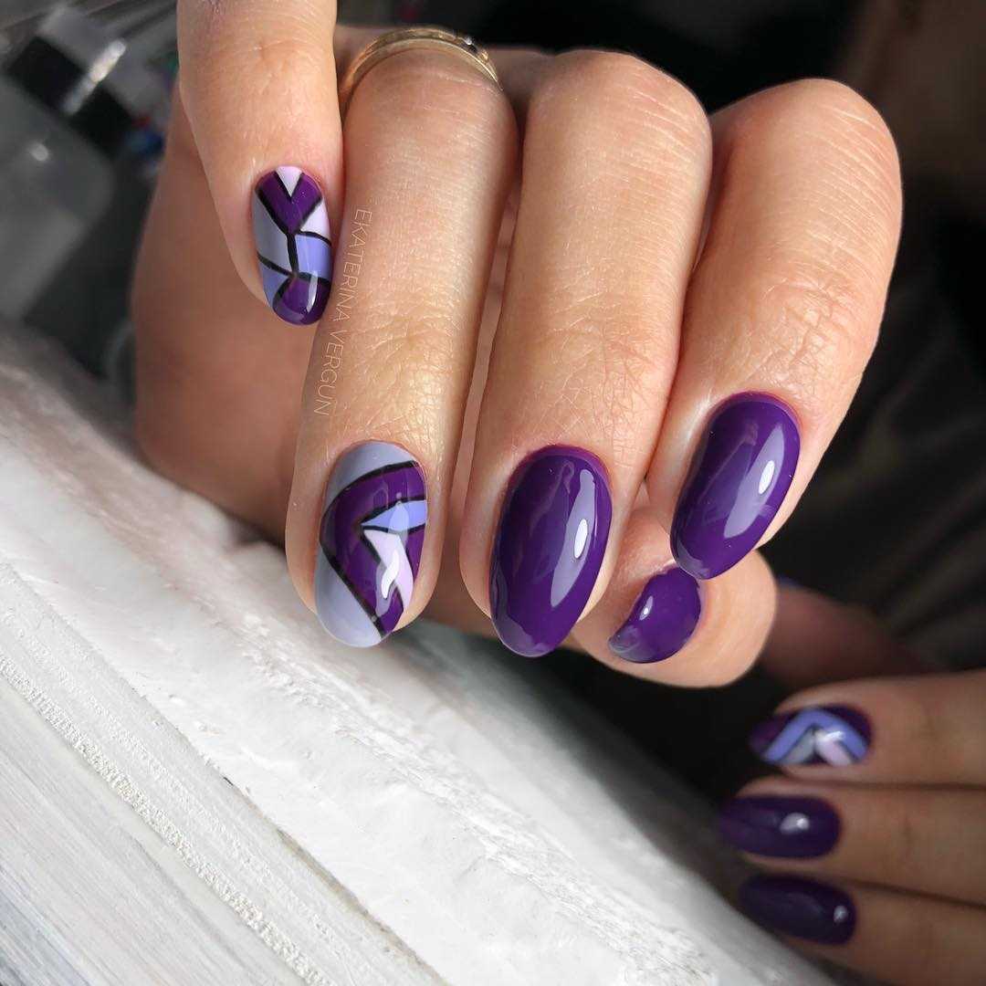 Чтобы фиолетовые оттенки не выглядели скучно, мастера часто добавляют контрастные черные акценты. Они обеспечивают эффект “вау” и динамичность, подчеркивают геометрические линии, узоры и различные текстуры. Черный и фиолетовый маникюр прекрасно смотрится в осенне-зимнем сезоне.