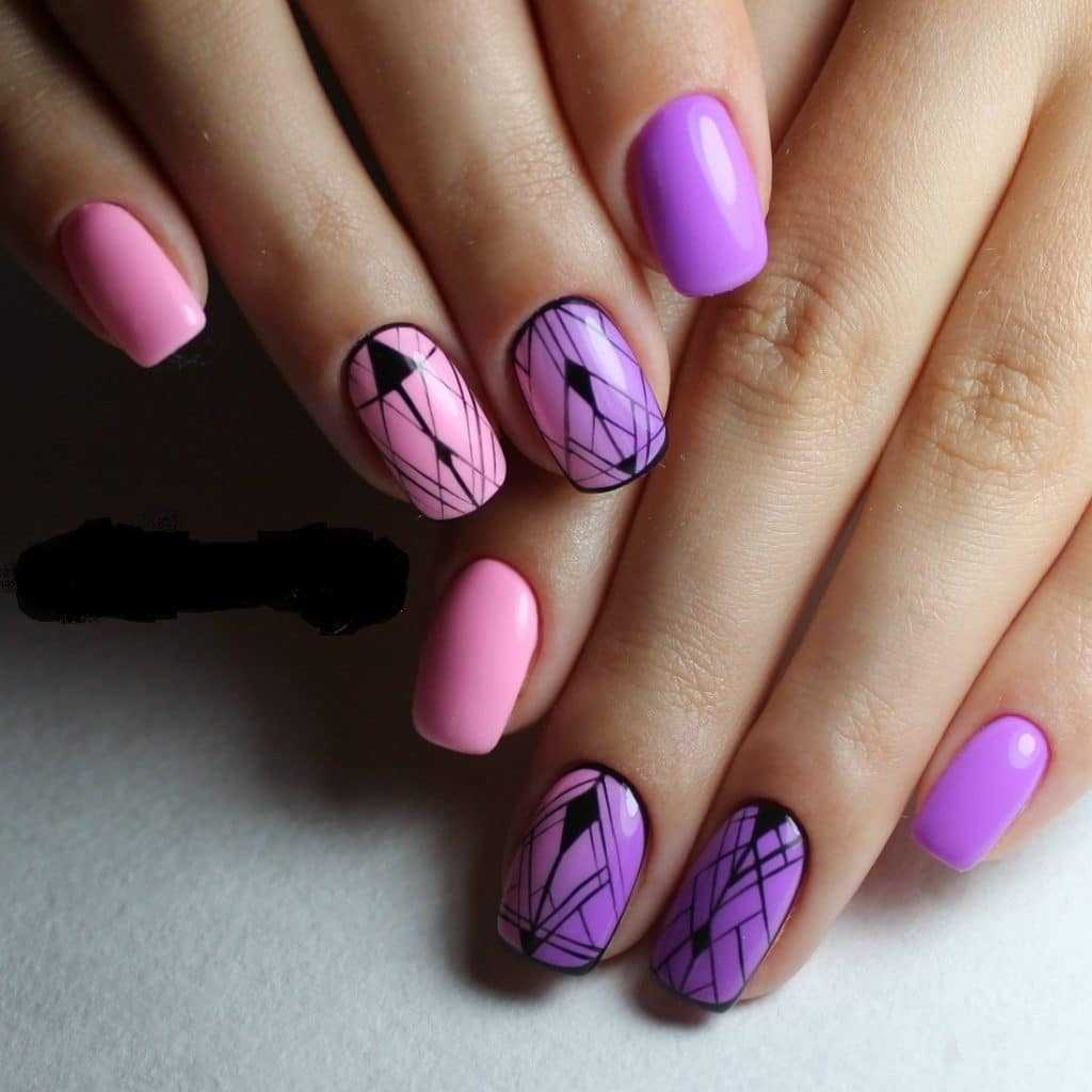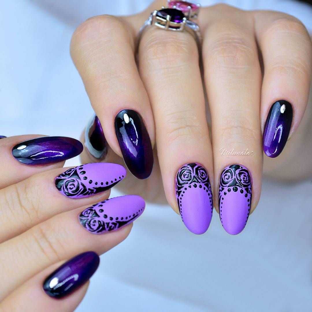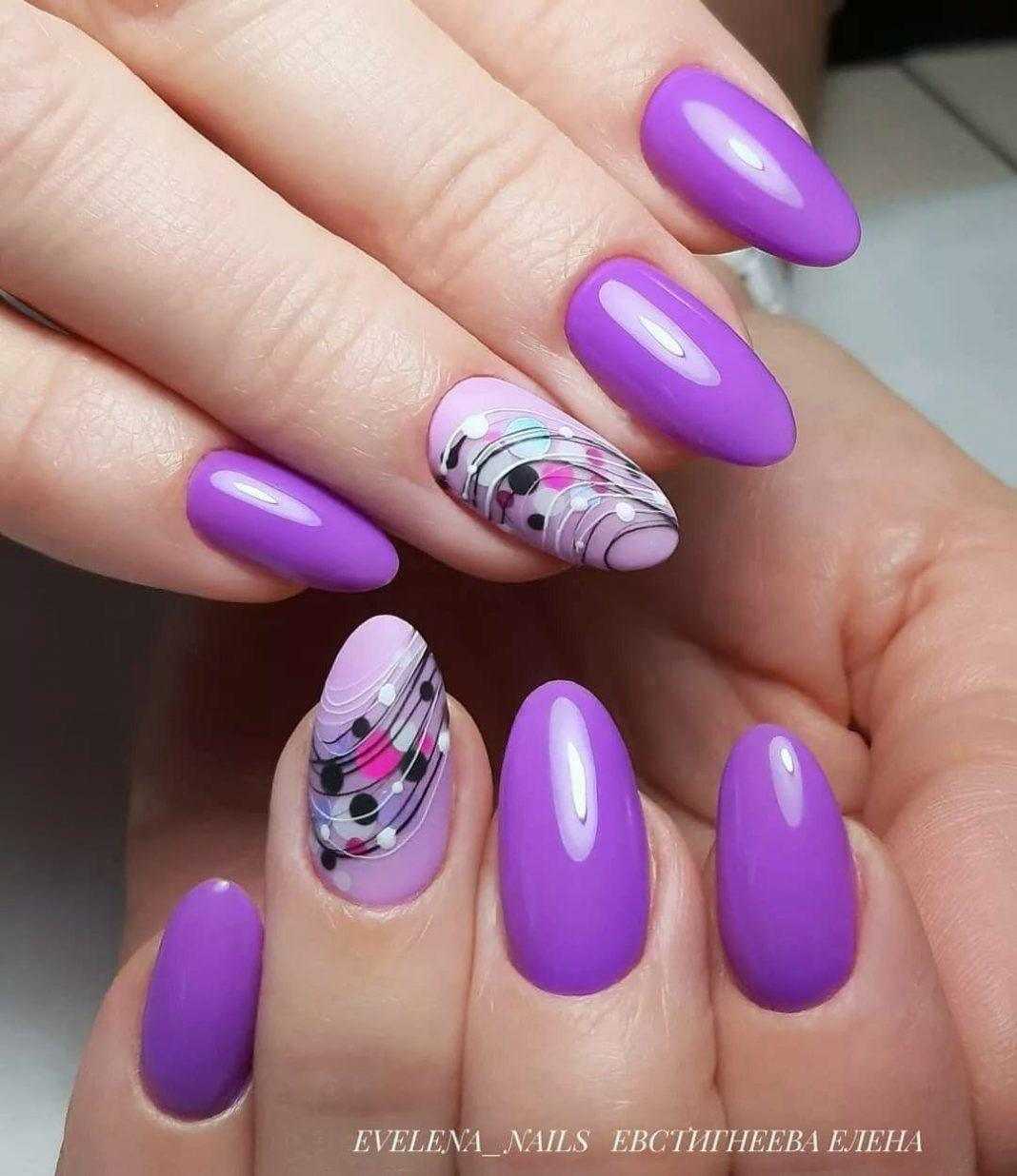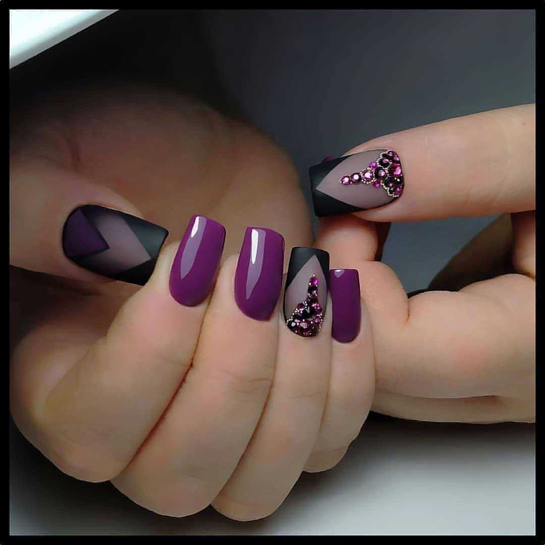 Чтобы фиолетовые оттенки не выглядели скучно, мастера часто добавляют контрастные черные акценты. Они обеспечивают эффект “вау” и динамичность, подчеркивают геометрические линии, узоры и различные текстуры. Черный и фиолетовый маникюр прекрасно смотрится в осенне-зимнем сезоне.