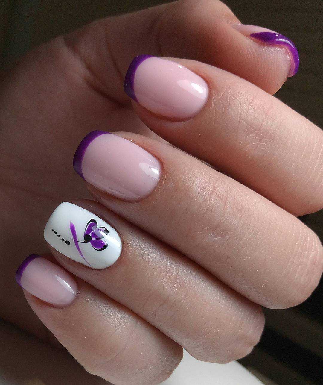Первое место по праву принадлежит классическому виду nail-дизайна — френчу. Для французского маникюра в фиолетовой гамме обычно берут светлые тона и базовый белый цвет. Получается летний ненавязчивый дизайн.