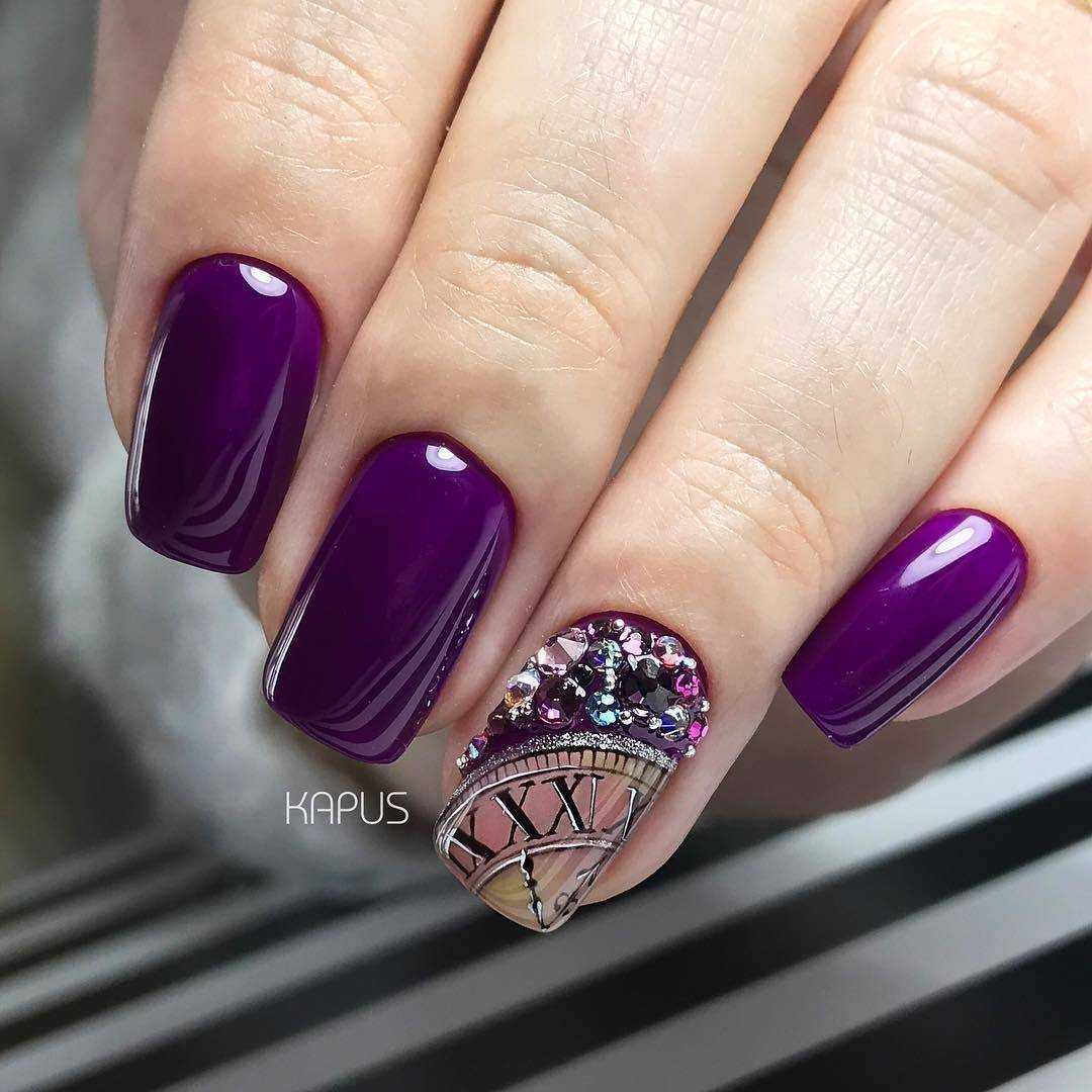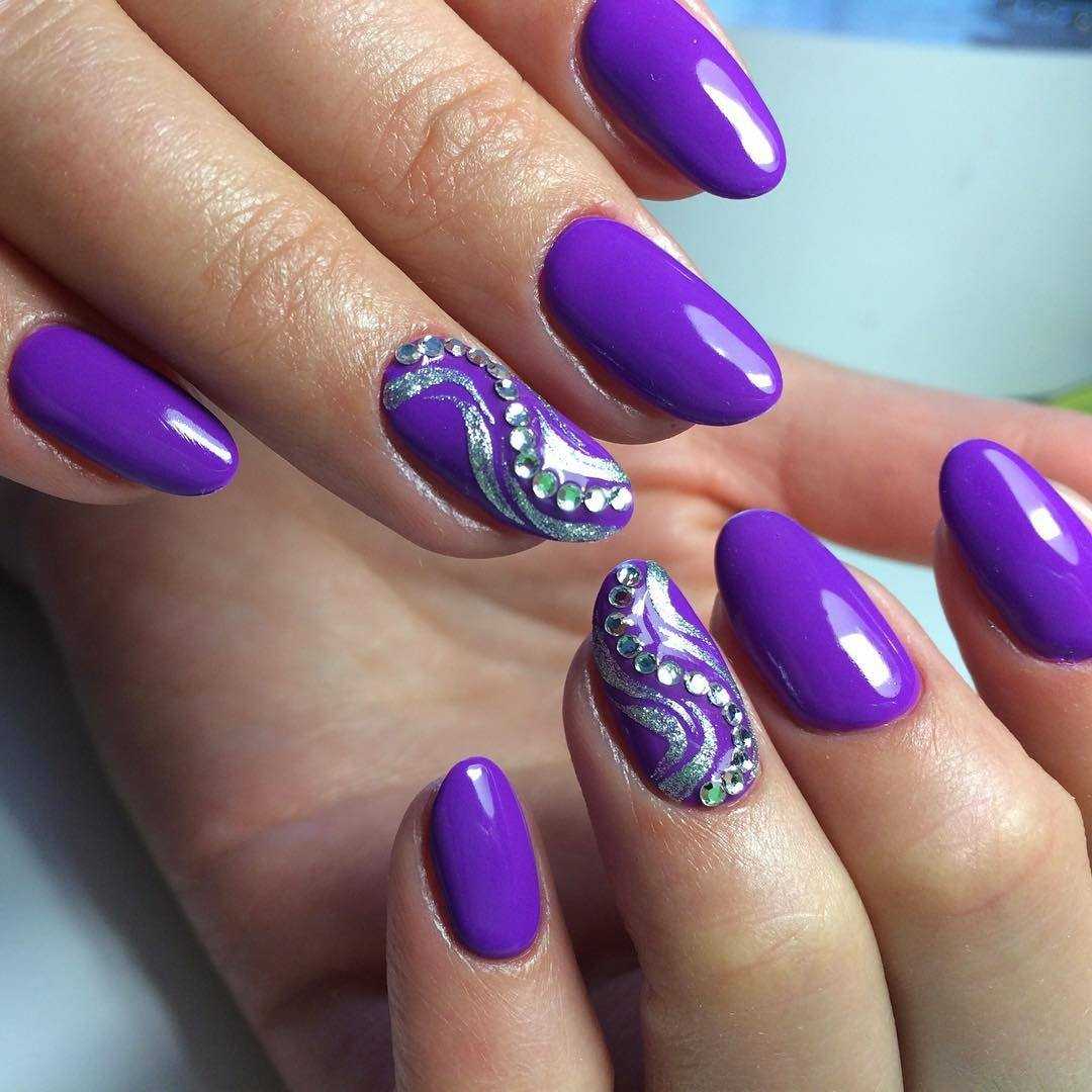 Фиолетовый цвет смотрится настолько насыщенно и глубоко, что может с успехом использоваться для создания однотонных нейл-артов. Дизайн великолепно смотрится как на длинных, так и на коротких ногтях.