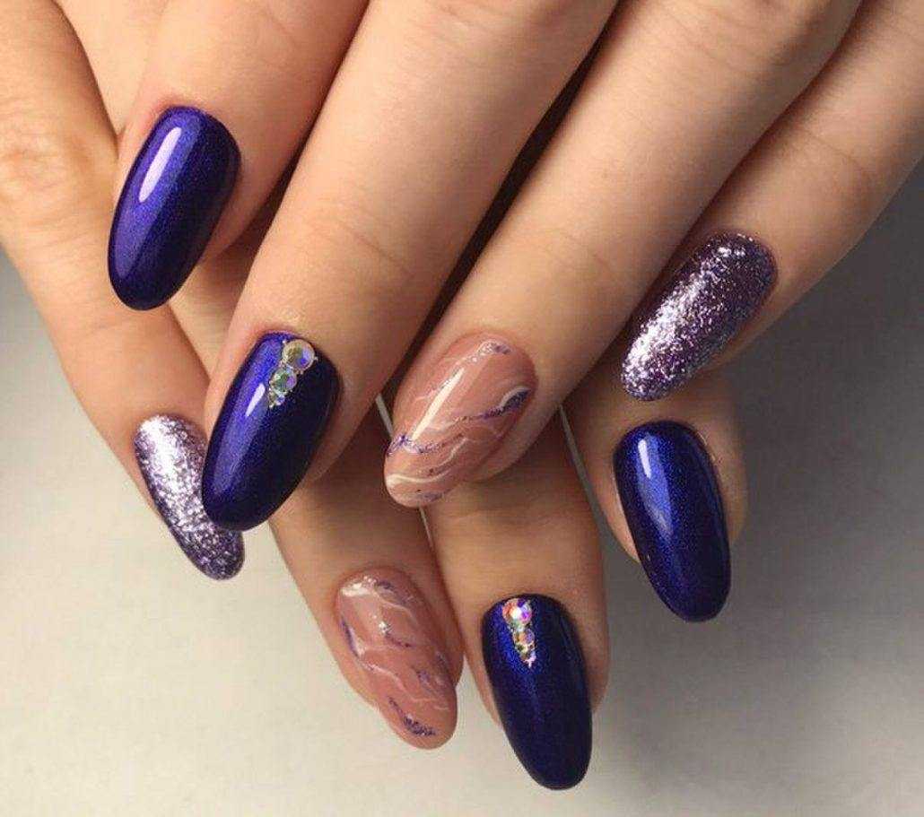 Синий — цвет, который поучаствовал в образовании оттенков фиолетовой гаммы. А значит он отлично подойдет для сочетания с сиреневым. Здесь отлично смотрится геометрический дизайн, градиент — вертикальный и горизонтальный, кошачий глаз, сочетание с синима хлопьями юкки на сиреневом фоне, втирка.