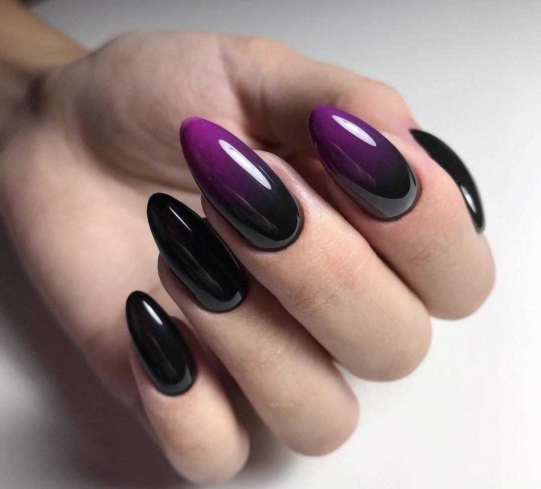 Здесь очень важно подобрать оттенки для дизайна. Главное, чтобы маникюр не был слишком тяжелым и мрачным. Отличный вариант — черно-сиреневый градиент, украшение сиреневой базы хлопьями юкки черного цвета или блестками