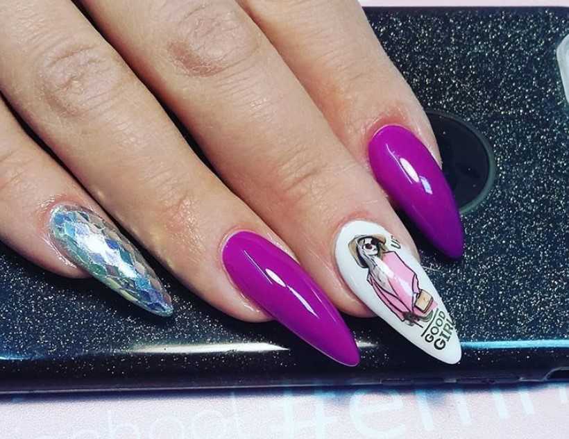 Яркий сиреневый обычно используют смелые барышни. Однако ногти должны быть безупречными. Любая погрешность сразу же оказывается заметной.